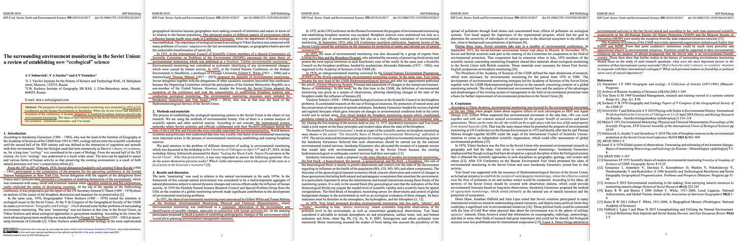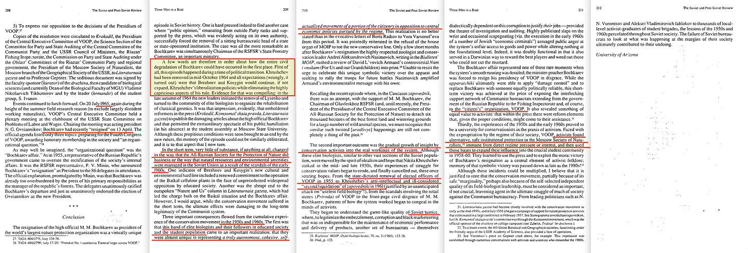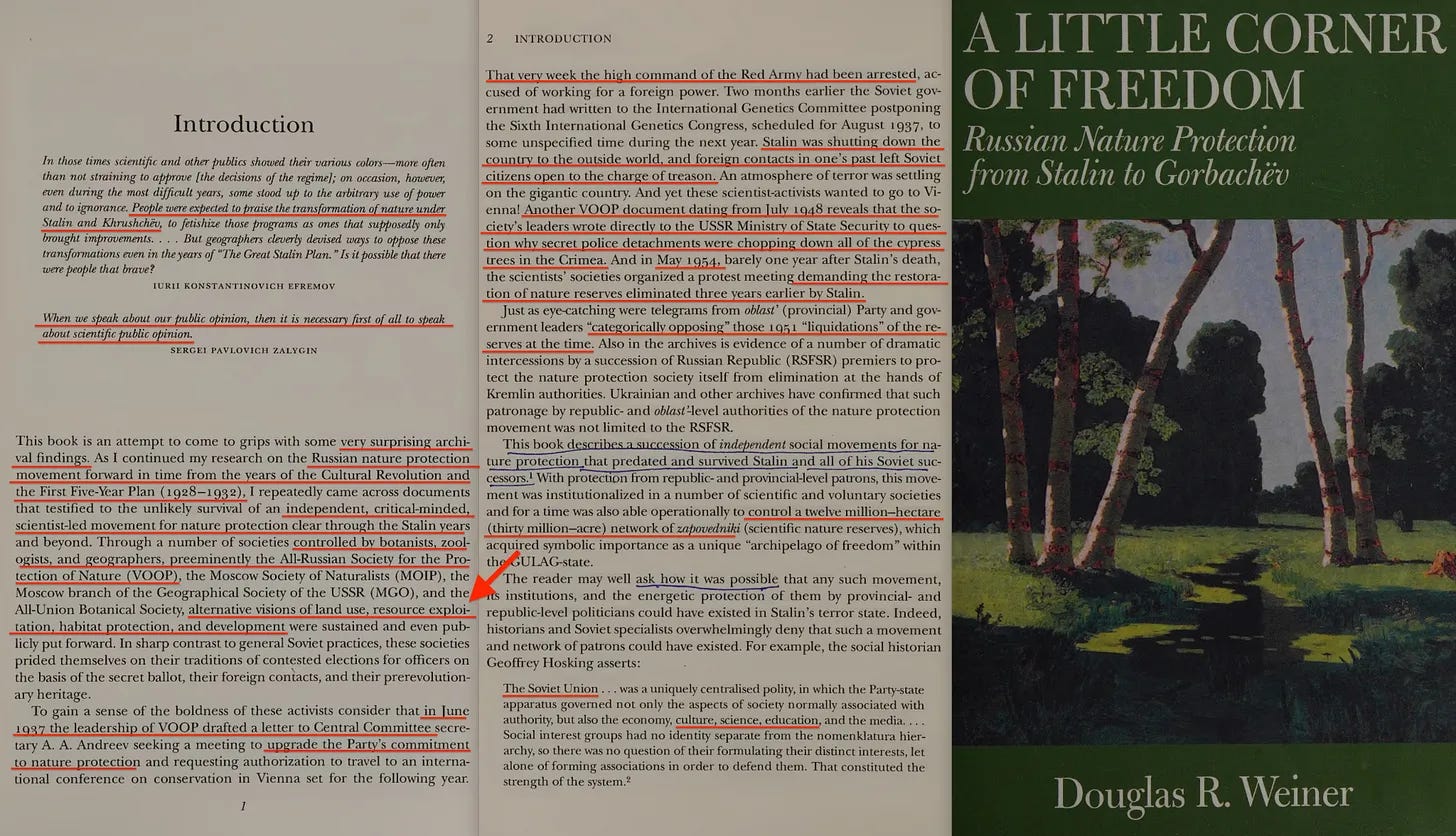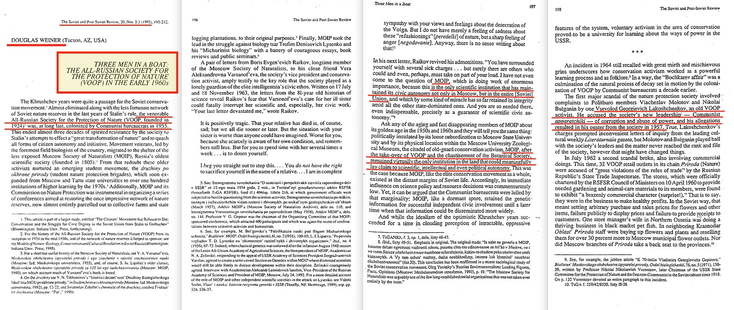 Το 1999, ο Douglas Weiner δημοσίευσε το: A Little Corner of Freedom [22], μια πρωτοποριακή μελέτη του σοβιετικού περιβαλλοντισμού. Στην εισαγωγή του, αποκαλύπτει: