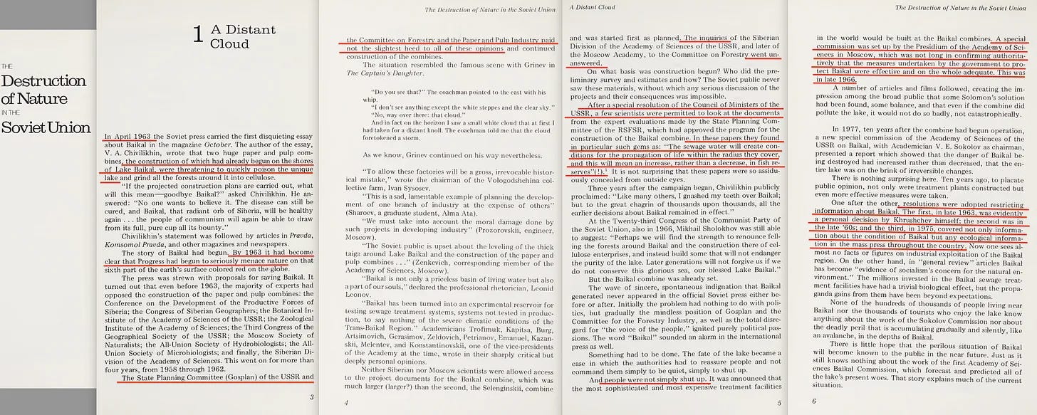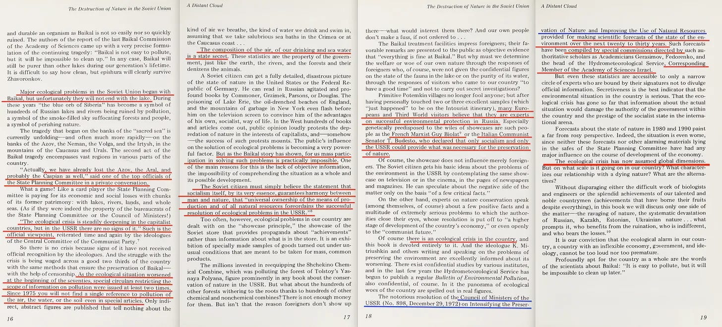 Αλλά εκθέτει περαιτέρω ότι μέχρι τα τέλη της δεκαετίας του ‘60, η Σοβιετική Ένωση δεν θα μπορούσε να νοιάζεται λιγότερο για την περιβαλλοντική καταστροφή, αλλά αναγκάστηκε να νοιαστεί από τις αρχές της δεκαετίας του ‘70 από ανάγκη.