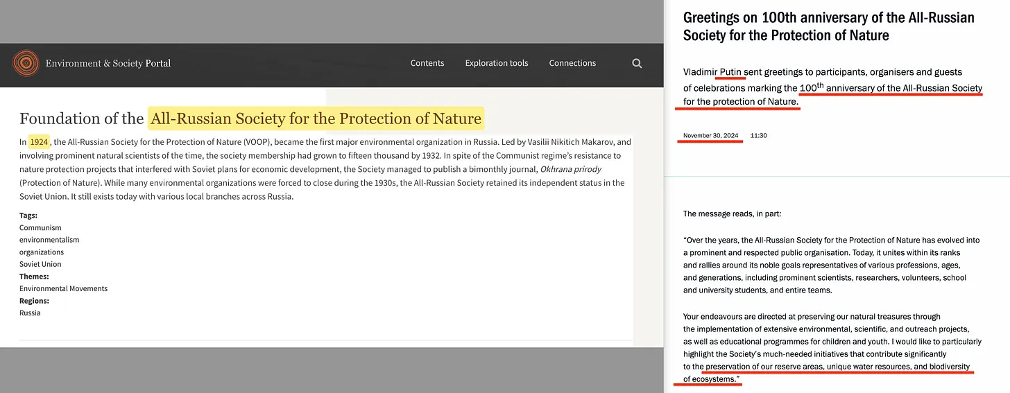 Το 2024, η Πανρωσική Εταιρεία για την Προστασία της Φύσης - κοινώς γνωστή ως VOOP - γιόρτασε την εκατονταετηρίδα της. Με την ευκαιρία αυτή, ακόμη και ο Βλαντιμίρ Πούτιν [21] έστειλε επίσημους χαιρετισμούς στην οργάνωση, επαινώντας την: