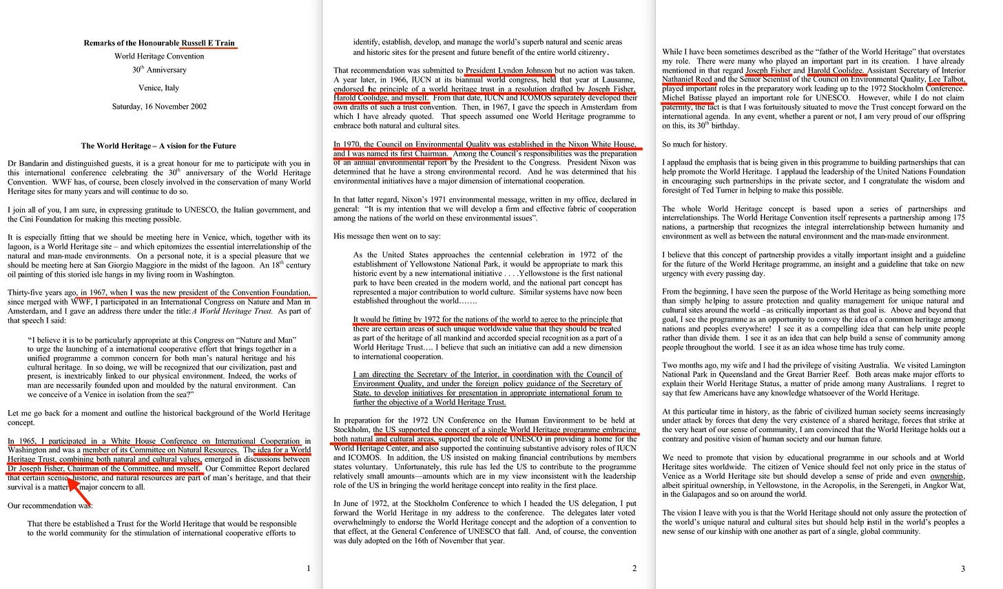 Και ενώ όλα αυτά εκτυλίσσονταν, ο Harold Coolidge και ο Russell E. Train συνυπογράφονταν αθόρυβα σε ένα σχέδιο πρότασης για αυτό που αργότερα θα γινόταν το Παγκόσμιο Καταπίστευμα Κληρονομιάς της UNESCO [17] -ένας μηχανισμός που έχει σχεδιαστεί για την παγκόσμια διατήρηση των τοπίων υπό υπερεθνική εποπτεία.