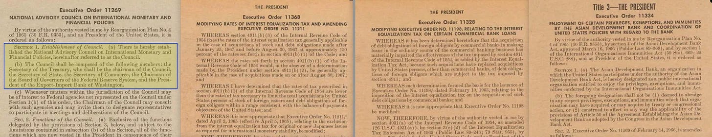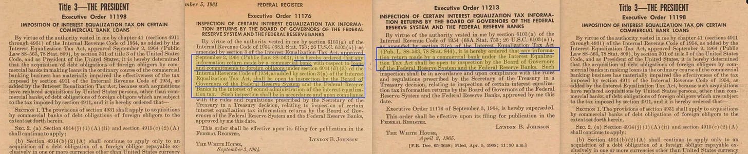 Αλλά καθώς ο πόλεμος του Βιετνάμ κλιμακώθηκε στην αρχή της δεύτερης θητείας του Johnson, ένα διαφορετικό είδος εκτελεστικής εντολής άρχισε να εμφανίζεται - αυτή τη φορά με επίκεντρο τα οικονομικά. Και είναι ενδιαφέρον ότι όλοι οι δικαιούχοι έδειχναν προς μια κατεύθυνση: την Ομοσπονδιακή Τράπεζα των ΗΠΑ. Με το πρόσχημα του εθνικού συμφέροντος, οι διαταγές αυτές διευκόλυναν τη διευρυμένη πρόσβαση σε χρηματοοικονομικά δεδομένα -ιδίως από τις μεγάλες εμπορικές τράπεζες- παρέχοντας στη Fed πρωτοφανή ορατότητα στη ροή του κεφαλαίου, των πιστώσεων και της οικονομικής συμπεριφοράς.
