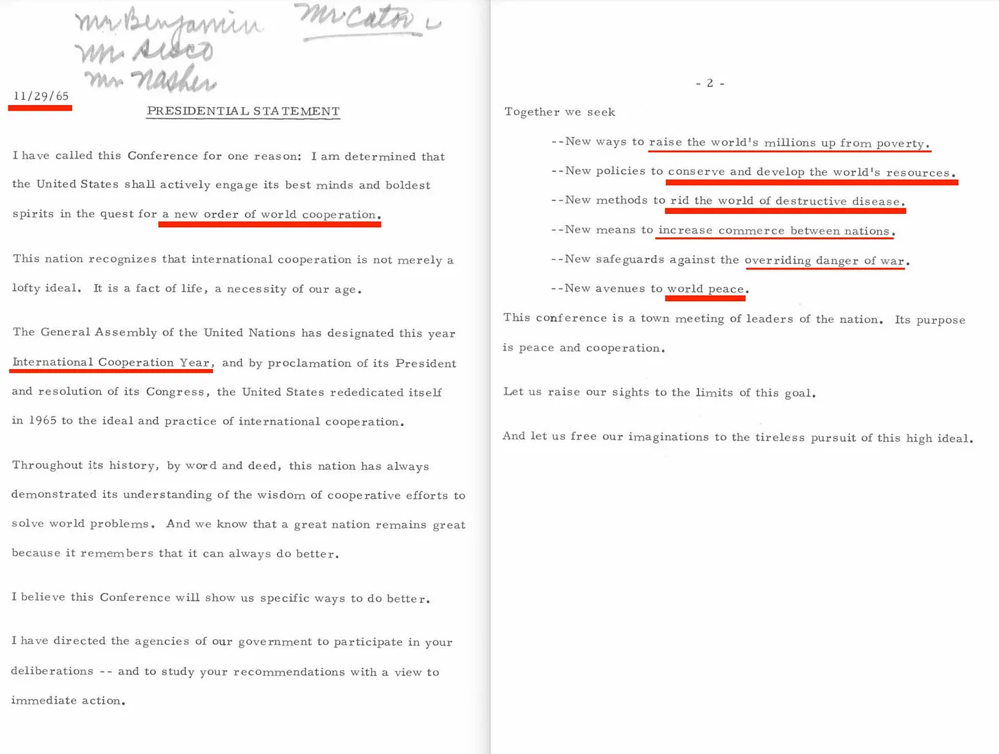 Εν τω μεταξύ, το 1965, συγκλήθηκε η Διάσκεψη του Λευκού Οίκου για τη Διεθνή Συνεργασία. Οι δηλωμένοι στόχοι της ήταν εντυπωσιακά οικείοι: η καθιέρωση μιας νέας τάξης παγκόσμιας συνεργασίας, η ανάπτυξη και η διατήρηση των παγκόσμιων πόρων, συντονισμένες μέθοδοι για την εξάλειψη των καταστροφικών ασθενειών και, φυσικά, η επιδίωξη της παγκόσμιας ειρήνης. Μια πορεία δράσης που, παραδόξως, φαίνεται να ευθυγραμμίζεται με ακρίβεια με εκτελεστικά διατάγματα που, εκείνη την εποχή, δεν είχαν ακόμη υπογραφεί.