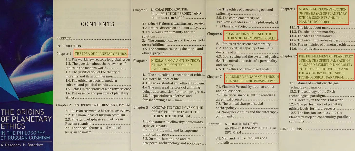 Όσο για την προέλευση της «Πλανητικής Ηθικής»... φαίνεται ότι και αυτή είναι ρωσική, σύμφωνα με το «The Origins of Planetary Ethics» που κυκλοφόρησε το 2019 [39]. Επίσης, περιλαμβάνει την ηθική της ελεγχόμενης εξέλιξης, την ηθική των εναρμονισμένων στόχων, την ηθική της υπέρβασης του κακού και την ηθική στη Νοόσφαιρα (Vernadsky).