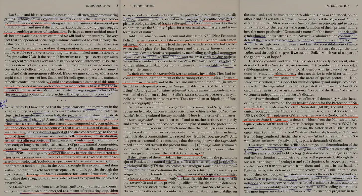 Αυτό το βιβλίο είναι μια προσπάθεια να έρθουμε σε επαφή με ορισμένα πολύ εκπληκτικά αρχειακά ευρήματα. Καθώς συνέχισα την έρευνά μου για το ρωσικό κίνημα προστασίας της φύσης προς τα εμπρός στο χρόνο από τα χρόνια της Πολιτιστικής Επανάστασης και του Πρώτου Πενταετούς Σχεδίου (1928-1932), έπεσα επανειλημμένα πάνω σε έγγραφα που μαρτυρούσαν την απίθανη επιβίωση ενός ανεξάρτητου, κριτικά σκεπτόμενου, επιστημονικά καθοδηγούμενου κινήματος για την προστασία της φύσης μέσα από τα χρόνια του Στάλιν και μετά. Μέσω ενός αριθμού εταιρειών που ελέγχονταν από βοτανολόγους, ζωολόγους και γεωγράφους, κυρίως της Πανρωσικής Εταιρείας για την Προστασία της Φύσης (VOOP), της Εταιρείας Φυσιολόγων της Μόσχας (MOIP), του παραρτήματος της Γεωγραφικής Εταιρείας της ΕΣΣΔ στη Μόσχα (MGO) και της Πανενωσιακής Βοτανικής Εταιρείας, διατηρήθηκαν και διατυπώθηκαν ακόμη και δημοσίως εναλλακτικά οράματα για τη χρήση της γης, την εκμετάλλευση των πόρων, την προστασία των οικοτόπων και την ανάπτυξη.