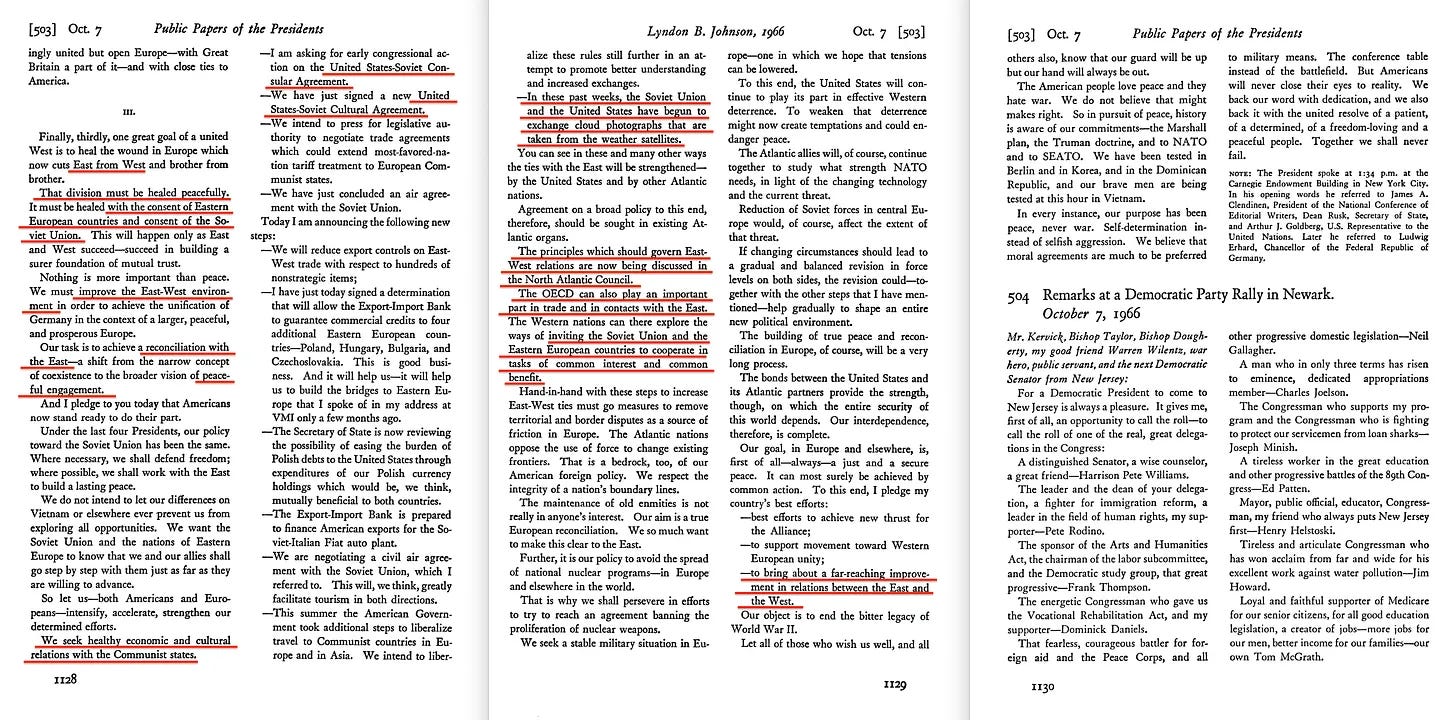 Αργότερα το ίδιο έτος, τον Οκτώβριο, ο Johnson έκανε νέες παρατηρήσεις -αυτή τη φορά απευθυνόμενος στο χάσμα Ανατολής-Δύσης στο πλαίσιο της Γερμανίας. Εκεί, ζήτησε τη δημιουργία ενός κοινού πλαισίου συνεργασίας Ανατολής-Δύσης, βασισμένου στο «κοινό καλό». Το όραμά του περιελάμβανε την επέκταση των νεοφιλελεύθερων εμπορικών πολιτικών του Woolf, τη δημιουργία μιας «ειρηνικής και δίκαιης παγκόσμιας τάξης», τη διαρκή «ειρηνική δέσμευση» μεταξύ των μπλοκ και την καλλιέργεια υγιέστερων οικονομικών και πολιτιστικών δεσμών με τη Σοβιετική Ένωση.