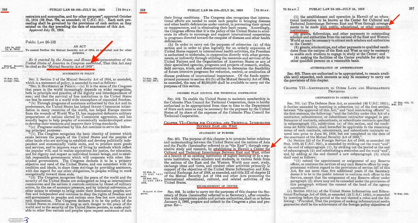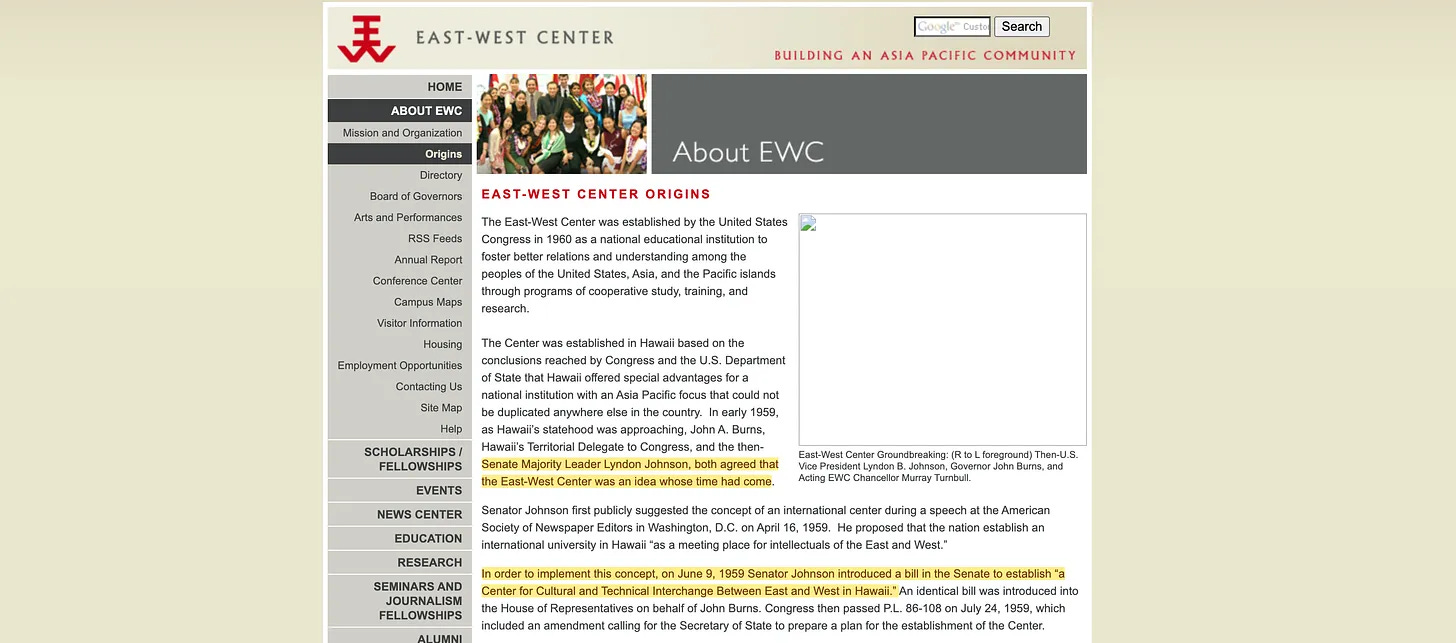 Αυτό που αξίζει επίσης να σημειωθεί εδώ είναι ότι ο Lyndon B. Johnson ήταν ένας από τους συνυποστηρικτές [6] της Πράξης Αμοιβαίας Ασφάλειας του 19597 - μιας νομοθεσίας που ζητούσε τη δημιουργία του Κέντρου Ανατολής-Δύσης στη Χονολουλού, ενός κόμβου σχεδιασμένου για την προώθηση της συνεργασίας μεταξύ των μπλοκ. Και, όπως θα περίμενε κανείς, συμμετείχαν ρητά οι ΜΚΟ από την αρχή.