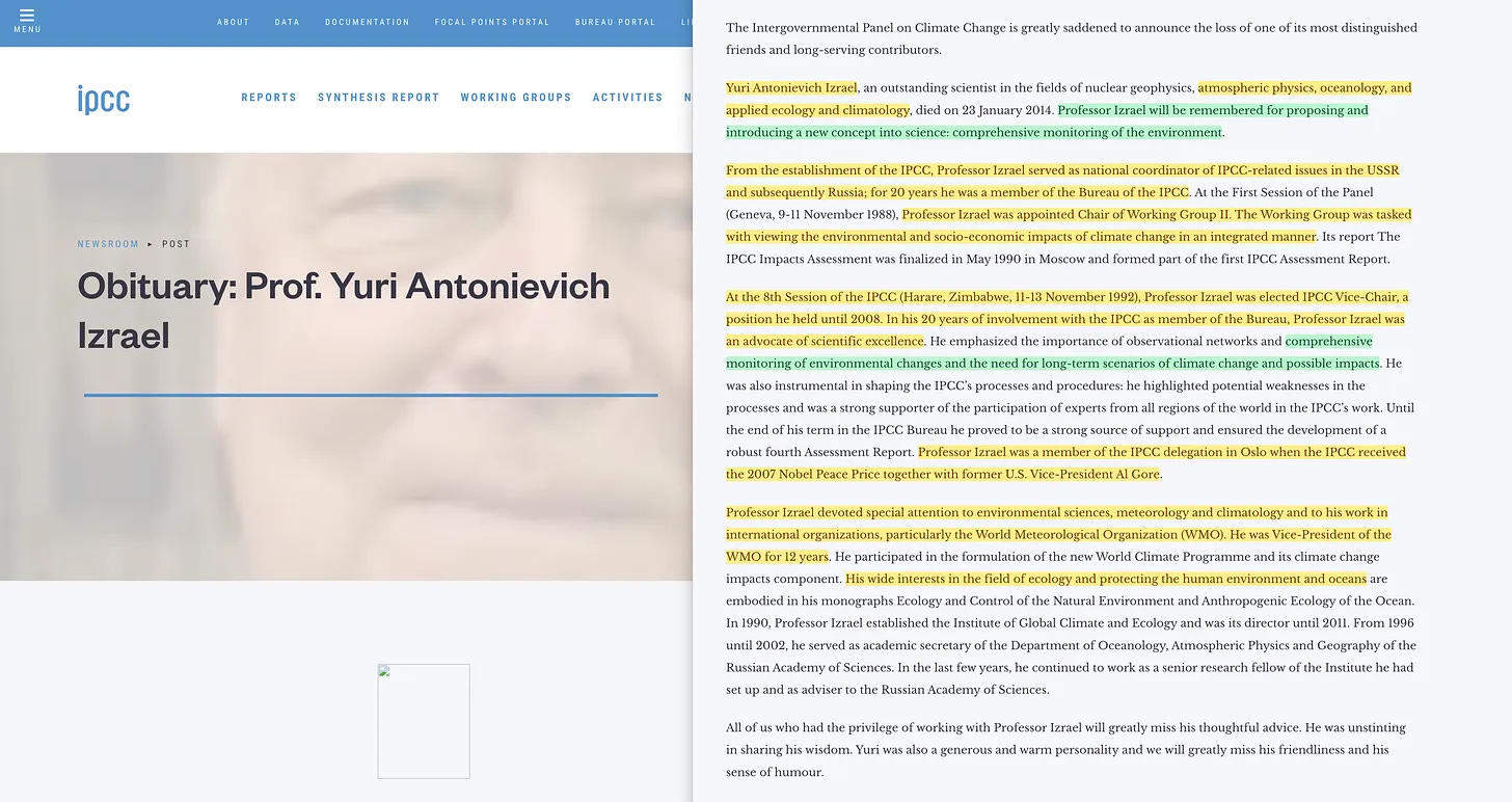 Λοιπόν, αυτό είναι μάλλον αστείο. Ο Izrael ήταν εκείνος που είχε αναλάβει την παραγωγή μελλοντικών περιβαλλοντικών προβλέψεων, ακριβώς του είδους που ο Moiseev επέμενε ότι δεν μπορούσε να γίνει. Και είκοσι χρόνια μετά τη συμφωνία ΗΠΑ-ΕΣΣΔ του 1972 -η οποία γέννησε, μεταξύ άλλων, το IIASA- φτάνουμε στο 1992, τη χρονιά που η IPCC προήγαγε τον Izrael σε αντιπρόεδρο. Οι ισχυρισμοί του τότε επικεντρώνονταν ειδικά στο διοξείδιο του θείου, και επομένως στην όξινη βροχή - ένα θέμα που πραγματικά αξίζει ένα δικό του κεφάλαιο. Οι κινδυνολογικές προβλέψεις που είχε εκδώσει το IIASA είχαν προκαλέσει τη δημιουργία ενός μοντέλου, και ήταν αυτό το μοντέλο που αργότερα υπολόγισε τις υποτιθέμενες περιβαλλοντικές βελτιώσεις που υποτίθεται ότι ακολούθησαν τις προσπάθειες καθαρισμού της Δύσης.