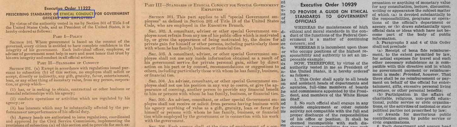 Αλλά -ίσως πιο αξιοσημείωτο- ο LBJ υπέγραψε επίσης εκτελεστικό διάταγμα που επέβαλε σημαντική επέκταση των «κωδίκων δεοντολογίας» για τους ομοσπονδιακούς υπαλλήλους. Αυτό που ξεκίνησε ως γραφειοκρατικό μέτρο σύντομα έθεσε τις βάσεις για κάτι πολύ μεγαλύτερο. Με την πάροδο του χρόνου, η πρωτοβουλία αυτή επεκτάθηκε για να συμπεριλάβει τη συντριπτική πλειονότητα όσων εργάζονται σε επιστημονικούς και τεχνικούς τομείς -ιδιαίτερα μέσω των προσπαθειών του SCRES της ICSU, που ιδρύθηκε το 1996, και του COMEST της UNESCO, που ιδρύθηκε τον επόμενο χρόνο, το 1997.