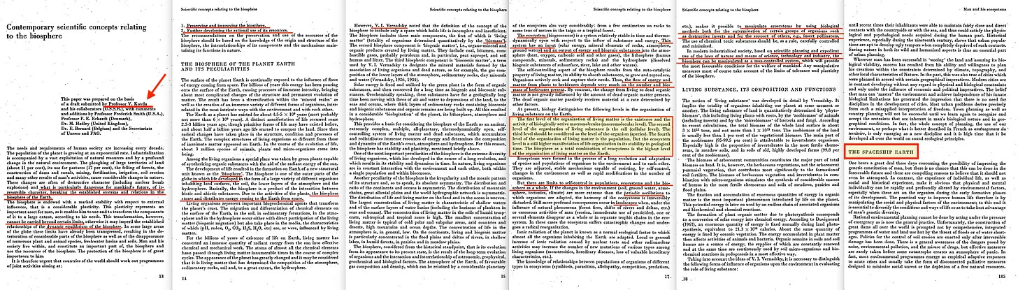 Από εκεί και πέρα, μια τελευταία ματιά στο υλικό του συνεδρίου της UNESCO για τα Αποθέματα Βιόσφαιρας [38] το 1968, καθώς ο Kovda... ουσιαστικά περιγράφει μια άποψη που ευθυγραμμίζεται ρητά με τη θεωρία συστημάτων (που προέρχεται από την Τεκτολογία του Alexander Bogdanov), περιγράφοντας τα οικοσυστήματα ως διακριτές μονάδες συστημάτων εισροών-εκροών (αυτή η ανάλυση του Leontief), πριν η ίδια η έκθεση στραφεί στη μεταφορά του διαστημόπλοιου Γη, η οποία εν συντομία θα πρέπει να εξηγήσει περί τίνος πρόκειται.