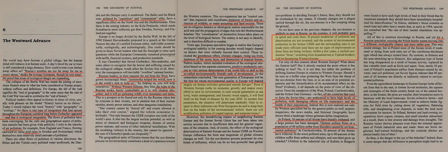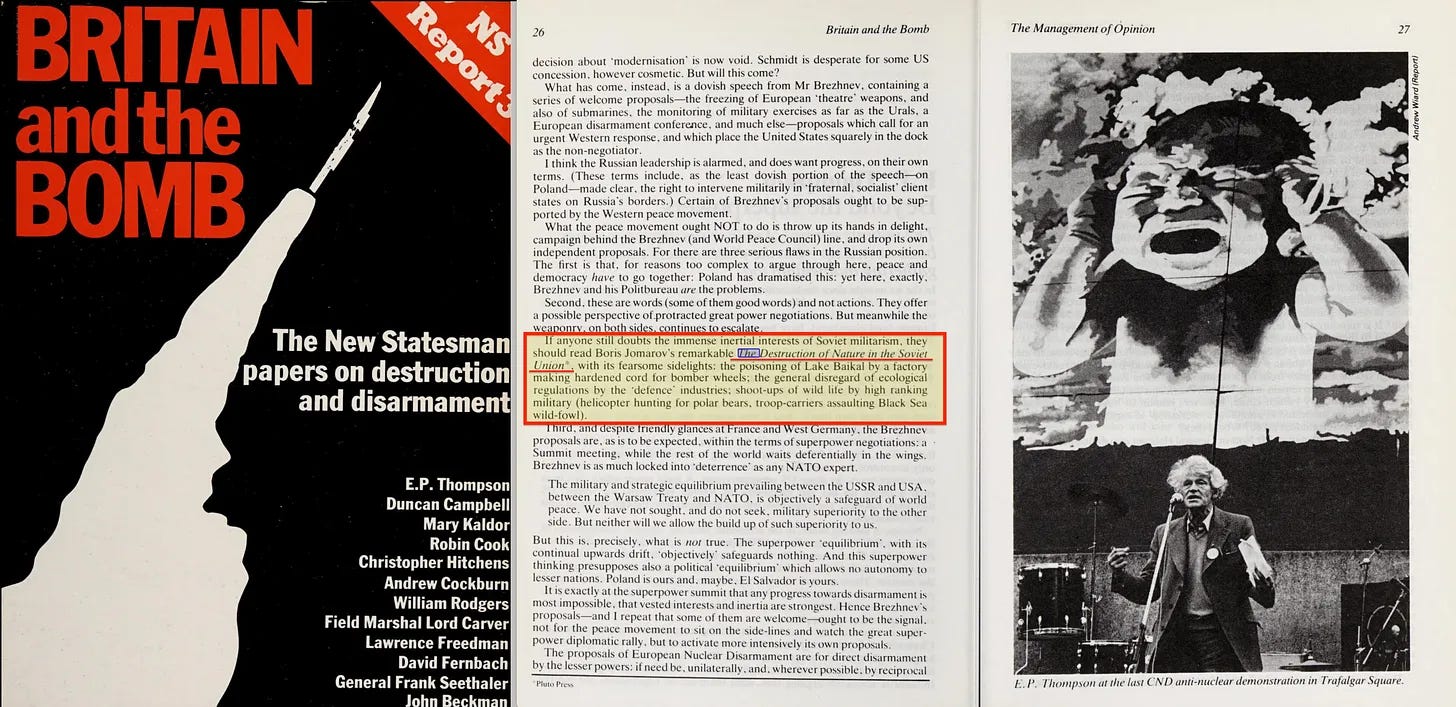 Αν κάποιος εξακολουθεί να αμφιβάλλει για τα τεράστια αδρανή συμφέροντα του σοβιετικού μιλιταρισμού, θα πρέπει να διαβάσει το αξιοσημείωτο βιβλίο του Boris Jomarov, The Destruction of Nature in the Soviet Union*. με τα τρομακτικά δευτερεύοντα στοιχεία του: η δηλητηρίαση της λίμνης Βαϊκάλης από ένα εργοστάσιο που κατασκεύαζε σκληρυμένο κορδόνι για τροχούς βομβαρδιστικών- η γενική περιφρόνηση των οικολογικών κανονισμών από τις αμυντικές βιομηχανίες- οι πυροβολισμοί άγριας ζωής από υψηλόβαθμους στρατιωτικούς (κυνήγι πολικών αρκούδων με ελικόπτερο, επίθεση στρατιωτικών αεροσκαφών σε άγρια πτηνά της Μαύρης Θάλασσας).