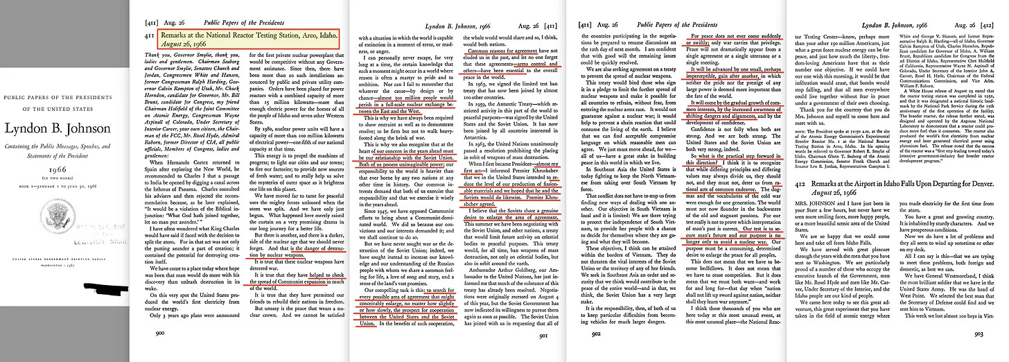 Μέχρι τον Αύγουστο του 1966 [4], ο Johnson έκανε δηλώσεις σε έναν σταθμό πυρηνικών δοκιμών, οι οποίες, αν και διατυπώθηκαν στο πλαίσιο της πυρηνικής διπλωματίας, διεύρυναν σημαντικά το όραμα: