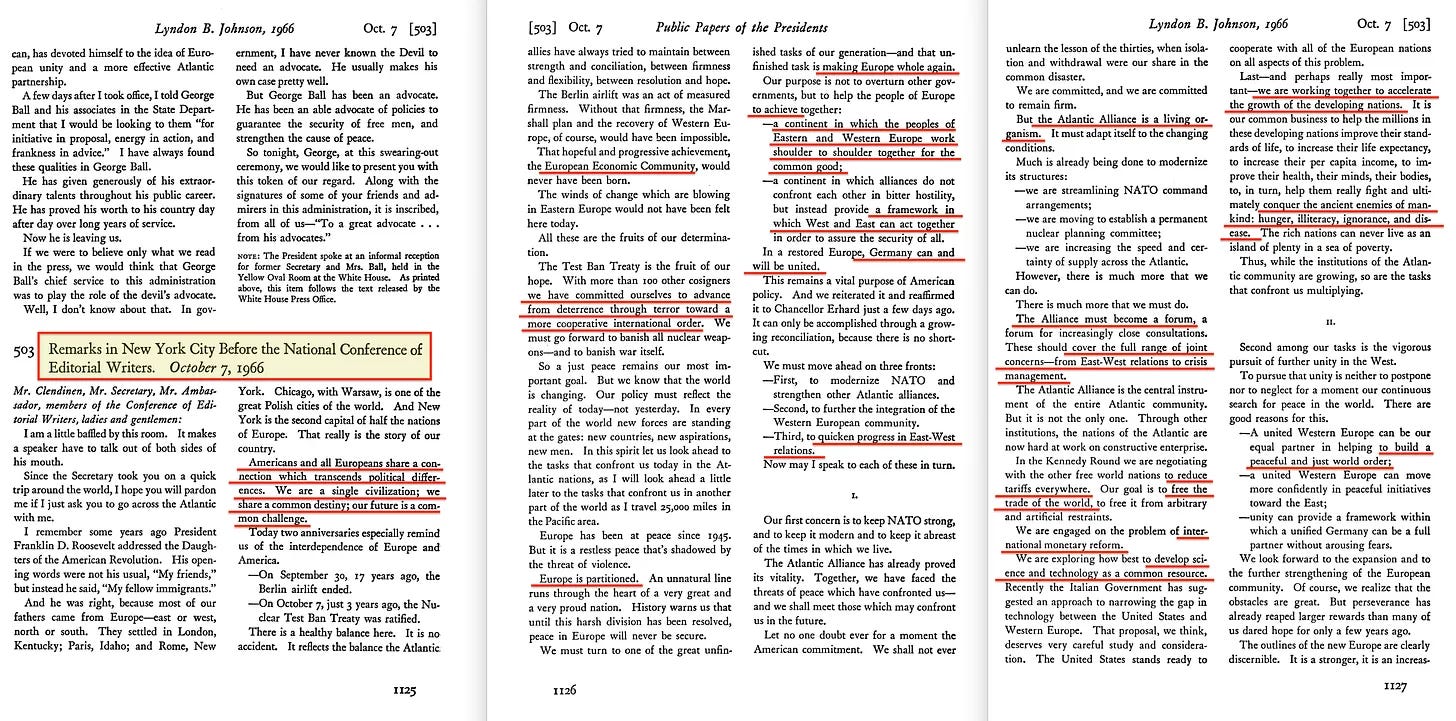 Αυτό κορυφώθηκε με την υπογραφή από τον Nixon της ιστορικής Συμφωνίας ΗΠΑ-ΕΣΣΔ για την προστασία του περιβάλλοντος στις 23 Μαΐου 1972. Αλλά το εννοιολογικό υπόβαθρο είχε ήδη τεθεί -και η ομιλία του Johnson αποκαλύπτει τη βαθύτερη στρατηγική λογική: