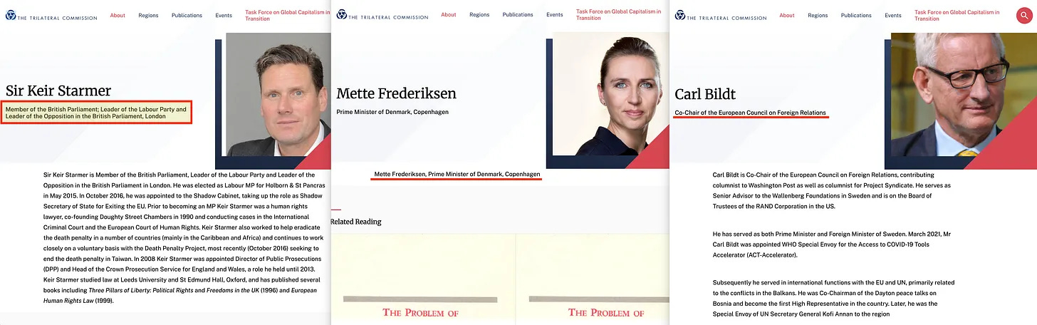 Και μετά την υπογραφή του Nixon τον Μάιο - και την ίδρυση της IIASA αργότερα την ίδια χρονιά, το 1972 - αυτές οι ΜΚΟ χρειάζονταν ένα φόρουμ, κάπου όπου θα μπορούσαν να σχεδιάσουν με ιδιωτικότητα εναντίον του λαού. Και ο David Rockefeller μετέφερε τη δάδα του καλέσματος του Brzezinski, ιδρύοντας την Τριμερή Επιτροπή το 1973 - μια οντότητα που συνεχίζεται μέχρι σήμερα, όπου τα μέλη της έχουν την ευκαιρία να χαράξουν στρατηγική για το πώς θα εκμεταλλευτούν καλύτερα τους λαούς του κόσμου μέσω των Τριμερών Δικτύων, που προτάθηκαν για πρώτη φορά από τον Wolfgang Reinicke σε μια έκθεση που συνυπογράφουν αρκετά μέλη της ίδιας της Τριμερούς Επιτροπής.