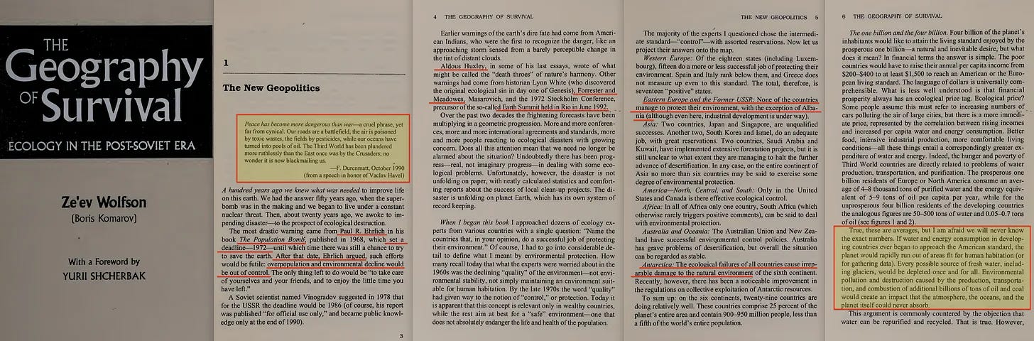 Παρ’ όλα αυτά, ο Boris Komarov -γνωστότερος με το πραγματικό του όνομα, Ze’ev Wolfson- κυκλοφόρησε ένα επόμενο έργο, τη Γεωγραφία της Επιβίωσης, στο οποίο συναντάμε γρήγορα γνωστές αναφορές: τη Λέσχη της Ρώμης, τον Paul Ehrlich και τη συνήθη παρέλαση κινδυνολογικών ισχυρισμών... κανένας από τους οποίους δεν έγινε ποτέ πραγματικότητα.