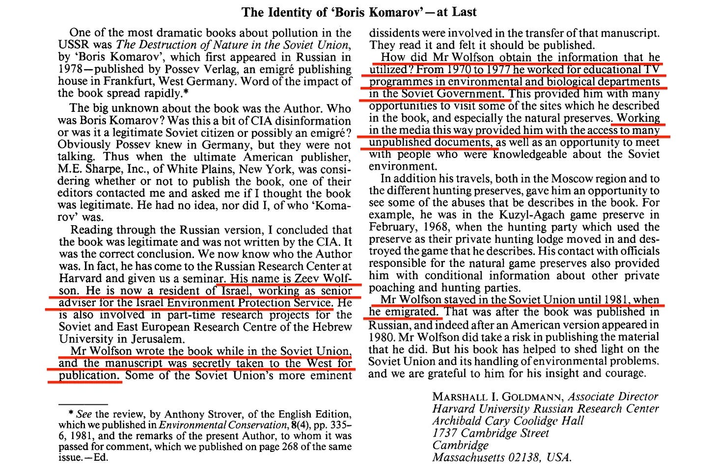 Ο Boris Komarov είναι ψευδώνυμο του Vladmir Volfson, ο οποίος από το 1968 έως το 1978 ήταν ανώτερος λέκτορας του Βιολογικού και Περιβαλλοντικού Τμήματος της Εκπαιδευτικής Τηλεόρασης στη Μόσχα. Η έκθεση δημοσιεύθηκε το 1980 από την Sharpe, White Plains, NY, με τον τίτλο The Destruction of Nature in the Soviet Union (Η καταστροφή της φύσης στη Σοβιετική Ένωση). Ο κ. Volfson μετανάστευσε στο Ισραήλ το 1981 και είναι ανώτερος σύμβουλος στην Υπηρεσία Προστασίας Περιβάλλοντος του Ισραήλ, Υπουργείο Εσωτερικών.
