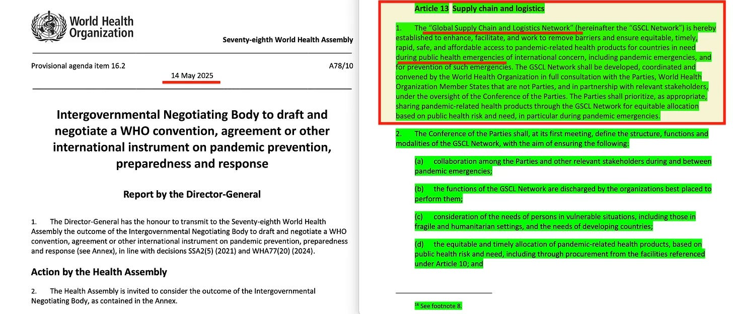 Παράλληλα, η Συνθήκη [1] απαιτεί τον κεντρικό έλεγχο των παγκόσμιων αλυσίδων εφοδιασμού κατά τη διάρκεια κηρυγμένων καταστάσεων έκτακτης ανάγκης στον τομέα της υγείας. Υπό το πρόσχημα της διασφάλισης ισότιμης πρόσβασης σε εμβόλια, διαγνωστικά και μέσα ατομικής προστασίας, η εθνική κυριαρχία επί των προμηθειών και της διανομής υποτάσσεται σε υπερεθνικούς μηχανισμούς συντονισμού. Ο ΠΟΥ, μαζί με τις κοινοπραξίες της βιομηχανίας και τις παγκόσμιες χρηματοδοτικές οντότητες, αποκτά εποπτεία σε πραγματικό χρόνο επί της παραγωγής, των αποθεμάτων και των αγωγών εφοδιαστικής - επιτρέποντας την αλγοριθμική ταξινόμηση του ποιος λαμβάνει τι, πότε και πώς. Τα μοντέλα προσομοίωσης της αλυσίδας εφοδιασμού καθορίζουν την κατανομή, με τις τοπικές συνθήκες να παρακάμπτονται από τους παγκόσμιους αλγορίθμους ισότητας. Αυτό το σύστημα, μόλις ενεργοποιηθεί, δεν γίνεται απλώς ένας υλικοτεχνικός μηχανισμός αλλά ένας ηθικός μηχανισμός - καθιστώντας την ίδια την πράξη της εθνικής ιεράρχησης μια πιθανή ηθική παραβίαση.