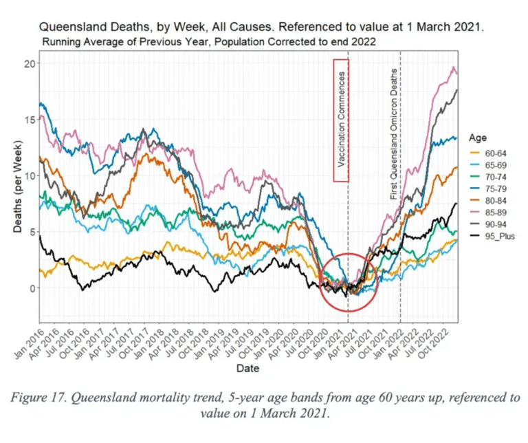Μια ιδιαίτερα ενδιαφέρουσα έκθεση που παρουσιάστηκε στην έρευνα της AMPS ήταν μια αυστραλιανή μελέτη για τις τάσεις της θνησιμότητας από όλες τις αιτίες που διεξήχθη στον πληθυσμό του Queensland πριν από τον ιό του ιού της κολπίτιδας αλλά μετά τον εμβολιασμό. Η ανάλυση έδειξε ότι οι θάνατοι άρχισαν να παρουσιάζουν αυξητική τάση με την εξάπλωση του εμβολίου covid και όχι του covid.