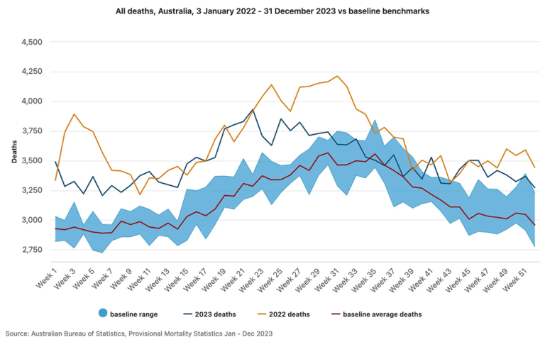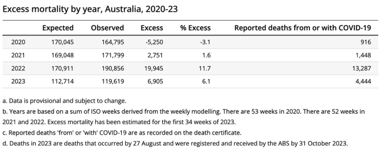 Αν και το 2023 παρατηρήθηκαν λιγότεροι υπερβολικοί θάνατοι, το ABS αναφέρει ότι η υπέρβαση ήταν "συνεχής" και "στατιστικά σημαντική" μέχρι το πρώτο εξάμηνο του 2023.