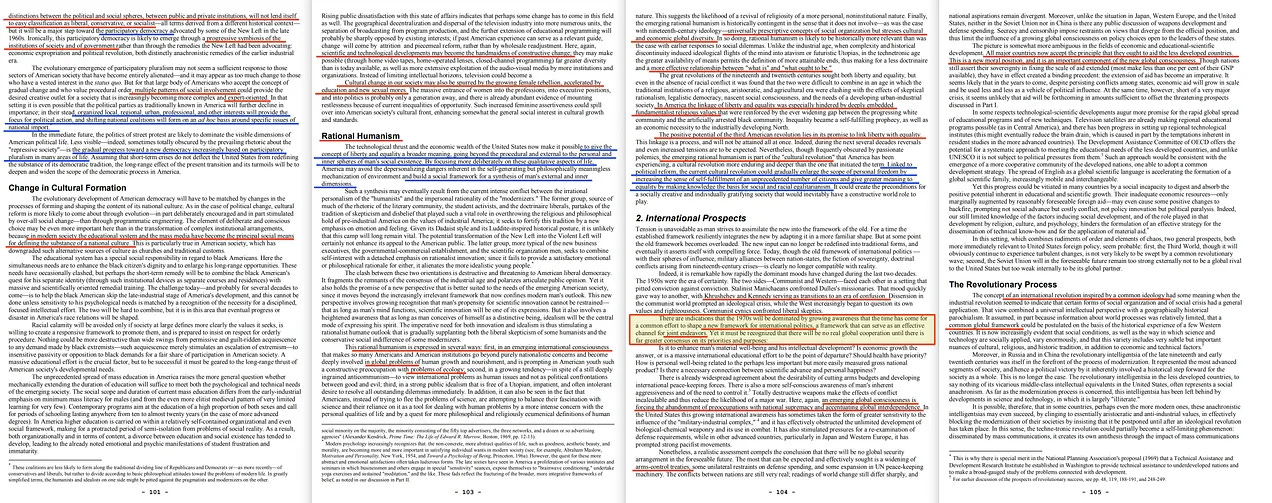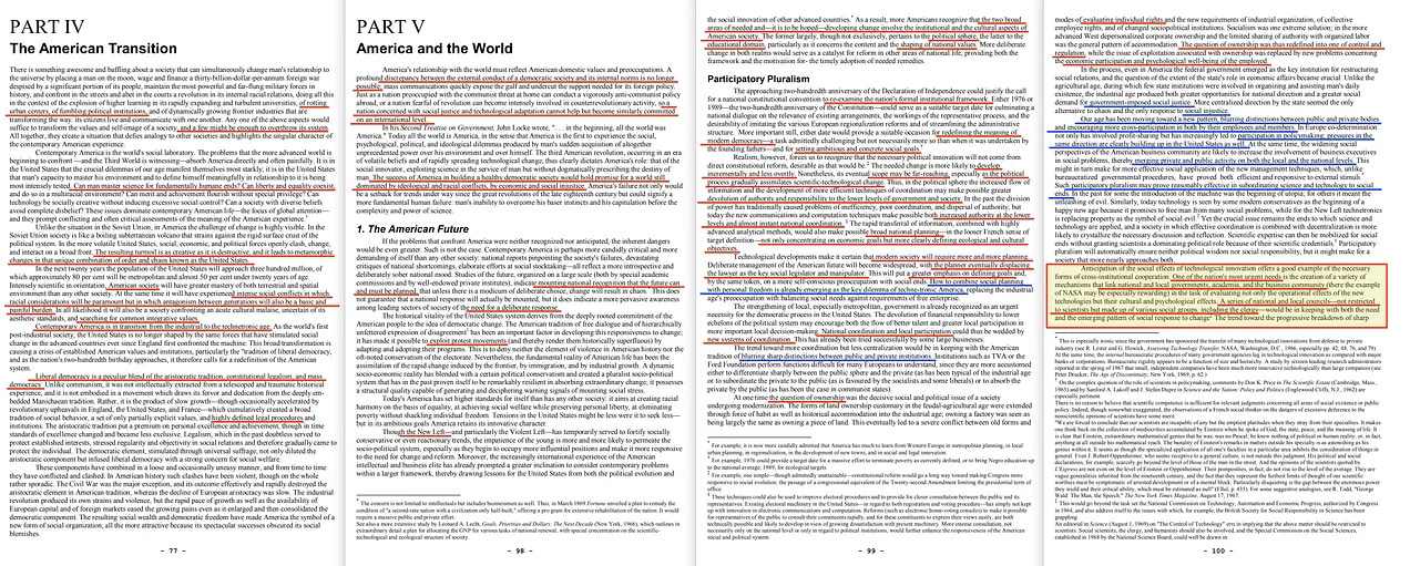 ... στη θέση τους, οργανωμένα τοπικά, περιφερειακά, αστικά, επαγγελματικά και άλλα συμφέροντα θα παρέχουν το επίκεντρο της πολιτικής δράσης, και μεταβαλλόμενοι εθνικοί συνασπισμοί θα σχηματίζονται σε ad hoc βάση γύρω από συγκεκριμένα ζητήματα εθνικής σημασίας... η σταδιακή πρόοδος προς μια νέα δημοκρατία που θα βασίζεται όλο και περισσότερο στον συμμετοχικό πλουραλισμό σε πολλούς τομείς της ζωής. Αν υποθέσουμε ότι οι βραχυπρόθεσμες κρίσεις δεν αποπροσανατολίζουν τις Ηνωμένες Πολιτείες από τον επαναπροσδιορισμό της ουσίας της δημοκρατικής τους παράδοσης, η μακροπρόθεσμη επίδραση της παρούσας μετάβασης και των αναταραχών της θα είναι η εμβάθυνση και η διεύρυνση του πεδίου εφαρμογής της δημοκρατικής διαδικασίας στην Αμερική.