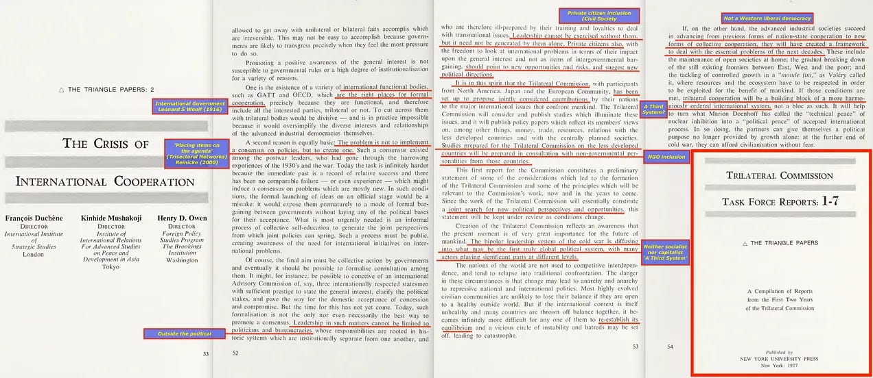 Το 1973, η Τριμερής Επιτροπή ξεκίνησε ως ένα φόρουμ το οποίο, στην πραγματικότητα, έθεσε τις βάσεις για τα μετέπειτα Τριμερή Δίκτυα του Wolfgang Reinicke: Συμπράξεις δημόσιου-ιδιωτικού τομέα-Κ.Ο.Ε. για το «κοινό καλό», όπου η CSO (ΜΚΟ) ορίζει το «κοινό καλό» -και η νόμιμη δημοκρατία έχει ελάχιστο, αν έχει, λόγο.