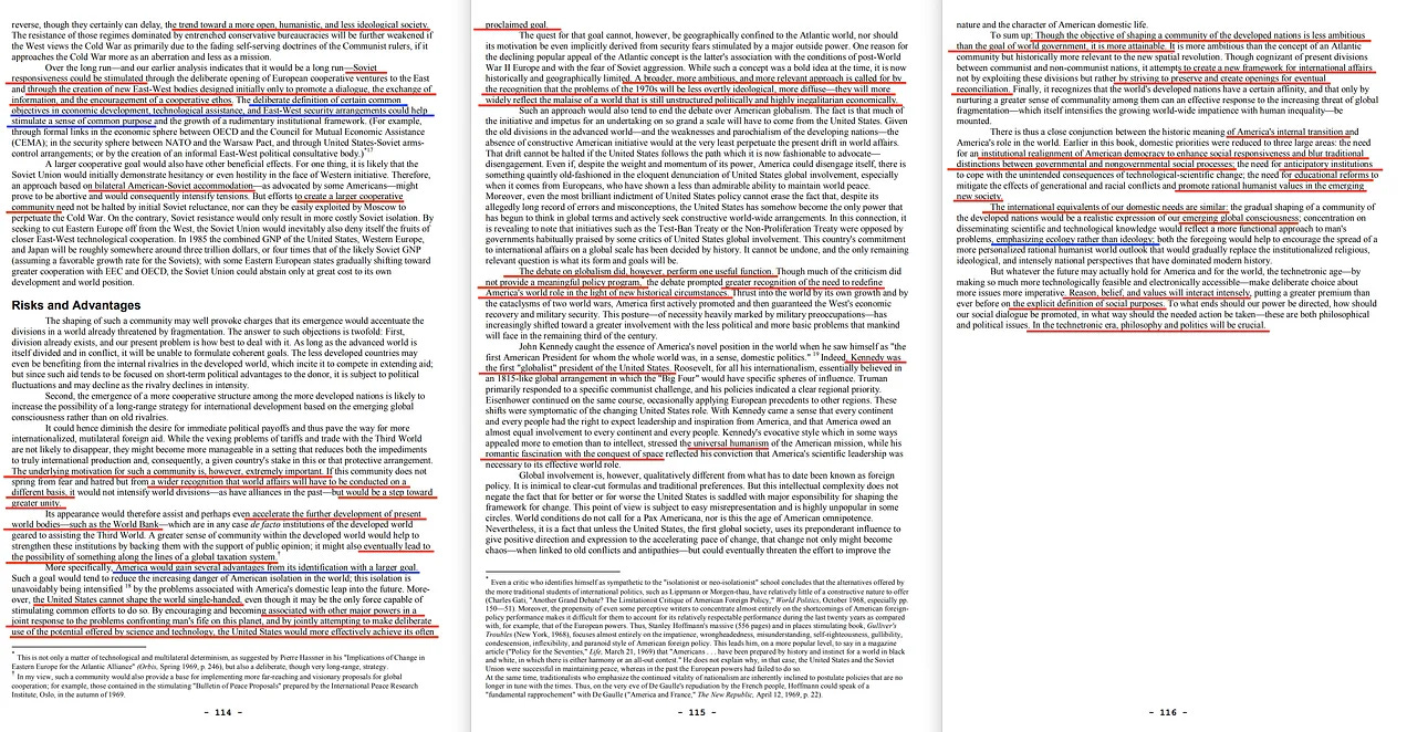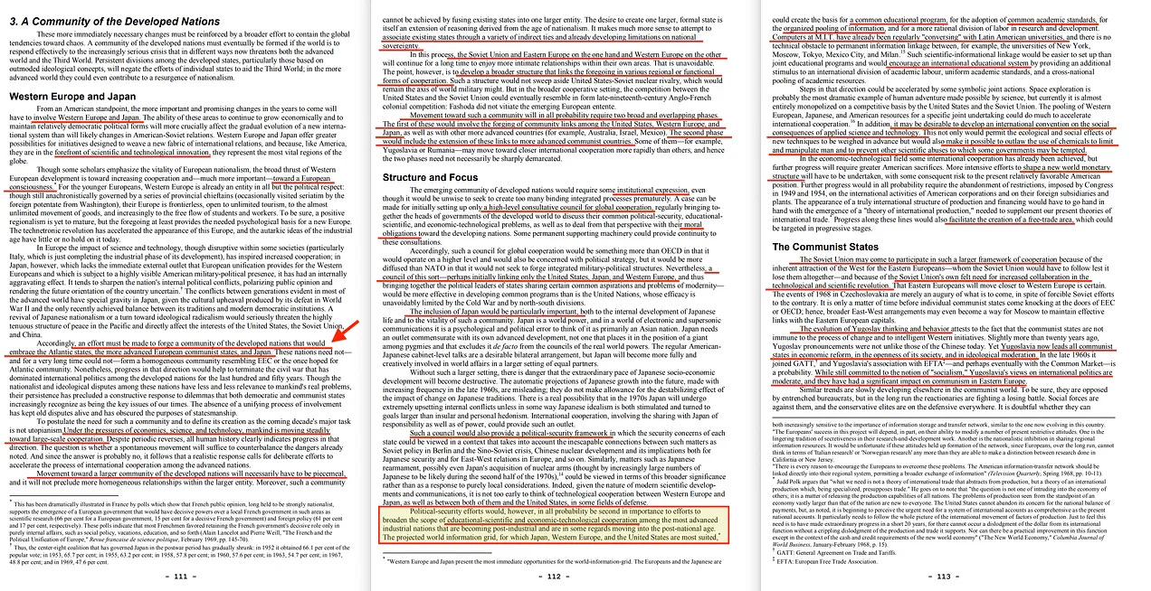Συνοψίζοντας: Αν και ο στόχος της διαμόρφωσης μιας κοινότητας των ανεπτυγμένων εθνών είναι λιγότερο φιλόδοξος από τον στόχο της παγκόσμιας κυβέρνησης, είναι πιο εφικτός. Είναι πιο φιλόδοξος από την έννοια της ατλαντικής κοινότητας, αλλά ιστορικά πιο συναφής με τη νέα χωρική επανάσταση. Αν και έχει επίγνωση των σημερινών διαιρέσεων μεταξύ κομμουνιστικών και μη κομμουνιστικών εθνών, επιχειρεί να δημιουργήσει ένα νέο πλαίσιο για τις διεθνείς υποθέσεις όχι εκμεταλλευόμενη αυτές τις διαιρέσεις αλλά προσπαθώντας να διατηρήσει και να δημιουργήσει ανοίγματα για ενδεχόμενη συμφιλίωση.