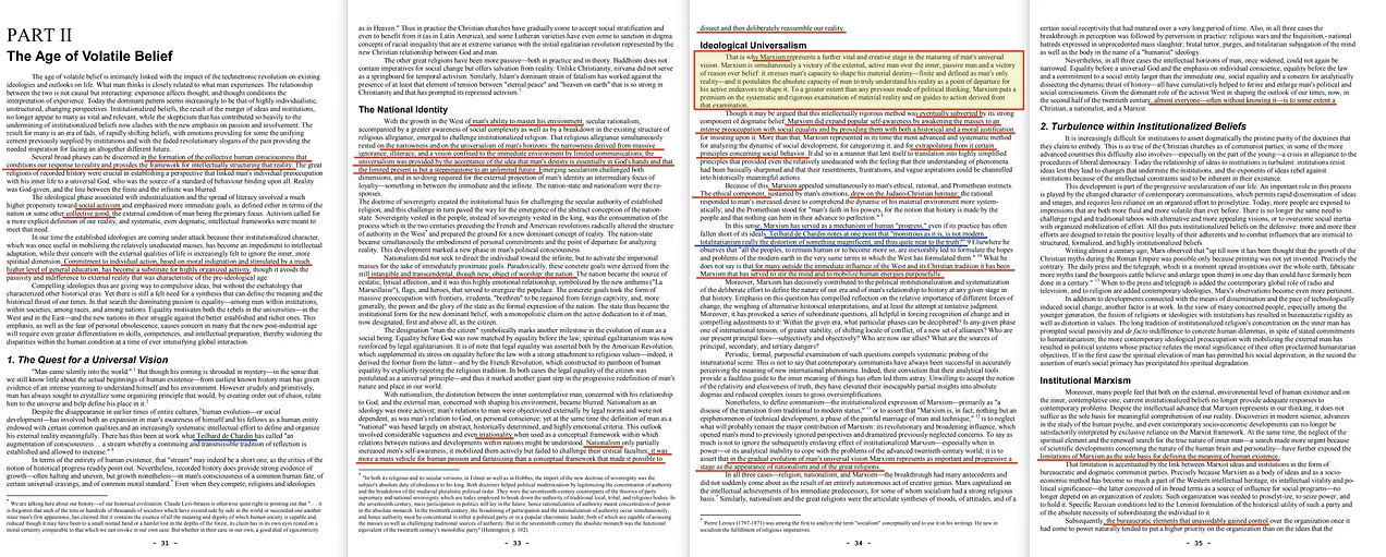 Ακολουθεί η εξαιρετικά επιλεκτική εξιστόρηση του Brzezinski για την προέλευση και τη λειτουργία του έθνους-κράτους, ακολουθούμενη από μια εξίσου μονόπλευρη αντιμετώπιση της θρησκείας. Στη συνέχεια, χωρίς ιδιαίτερη προειδοποίηση, πέφτει στα γόνατα με θαυμασμό για τον μαρξισμό -αν και σπεύδει να διευκρινίσει ότι απλώς εφαρμόστηκε λανθασμένα. Η πρόθεση, μας διαβεβαιώνει, ήταν ευγενής: η προσπάθεια για το «κοινό καλό».