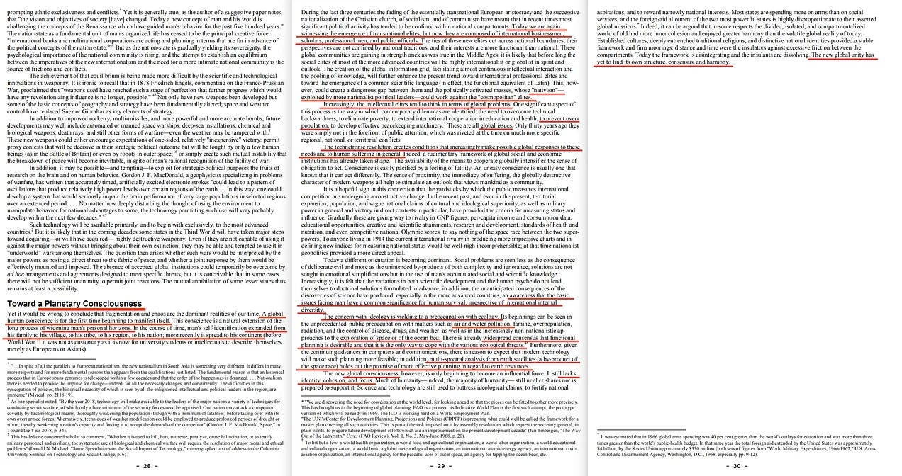Υπάρχουν ενδείξεις ότι η δεκαετία του 1970 θα κυριαρχηθεί από την αυξανόμενη συνειδητοποίηση ότι έχει έρθει η ώρα για μια κοινή προσπάθεια να διαμορφωθεί ένα νέο πλαίσιο για τη διεθνή πολιτική, ένα πλαίσιο που μπορεί να χρησιμεύσει ως αποτελεσματικός δίαυλος για κοινές προσπάθειες. Ωστόσο, πρέπει να αναγνωριστεί ότι δεν θα υπάρξει πραγματική παγκόσμια συνεργασία μέχρις ότου υπάρξει πολύ μεγαλύτερη συναίνεση σχετικά με τις προτεραιότητες και τους σκοπούς της... . μια αναδυόμενη παγκόσμια συνείδηση επιβάλλει την εγκατάλειψη της ενασχόλησης με την εθνική υπεροχή και δίνει έμφαση στην παγκόσμια αλληλεξάρτηση.