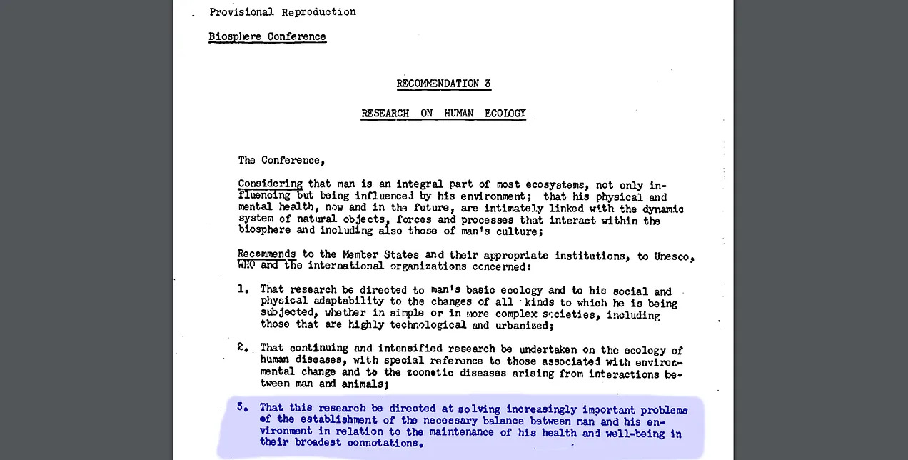 Αυτή η λογική -η εξισορρόπηση της ανθρωπότητας με τη φύση- παρουσιάστηκε για πρώτη φορά επίσημα στη Διάσκεψη της UNESCO για τη Βιόσφαιρα το 1968. Εκεί, ο René Dubos του Πανεπιστημίου Rockefeller (καθαρά συμπτωματικά, είμαι σίγουρος) συνέταξε τη Σύσταση 3, προειδοποιώντας για τους κινδύνους που εγκυμονούν οι ζωονόσοι που αναδύονται από την αυξημένη επαφή μεταξύ ανθρώπων και ζώων.