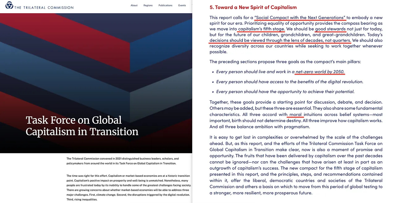 Σε αυτούς τους πιο σύγχρονους καιρούς, η Τριμερής Επιτροπή καλεί τώρα για ένα «νέο πνεύμα καπιταλισμού», βασισμένο στην «ηθική», ακόμη και στον «καπιταλισμό χωρίς αποκλεισμούς» - δήθεν για να αντιμετωπιστούν συστημικά ζητήματα κοινωνικής αδικίας. Αν και θα μπορούσατε, ίσως με μεγαλύτερη ακρίβεια, να το αποκαλέσετε Εξελικτικό Σοσιαλισμό του Eduard Bernstein (1899) - ο ίδιος εμπνευσμένος από το πλαίσιο του Julius Wolf του 1892.