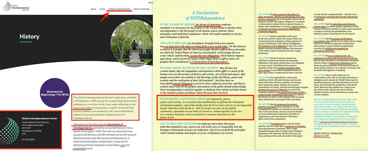 Ακολουθεί η ενότητα του Brzezinski για τον «συμμετοχικό πλουραλισμό» - μια ευγενική φράση που ακούγεται ευγενικά και κρύβει τον επαναπροσδιορισμό της ίδιας της δημοκρατίας. Και εδώ, από καθαρή σύμπτωση είμαι σίγουρος, βρίσκουμε τη «Διακήρυξη της Αλληλεξάρτησης» του 1975, που συντάχθηκε από τον Henry Steele Commager. Όχι μόνο καλεί ανοιχτά για μια Νέα Παγκόσμια Τάξη, αλλά παρουσιάζεται επίσης υπερήφανα στην ενότητα «Ιστορία» του Παγκόσμιου Κέντρου Διασύνδεσης, το οποίο φιλοξενείται, όπως αρμόζει, από την Ομοσπονδιακή Τράπεζα της Φιλαδέλφειας, με το δικό της Κολέγιο Κεντρικών Τραπεζιτών.