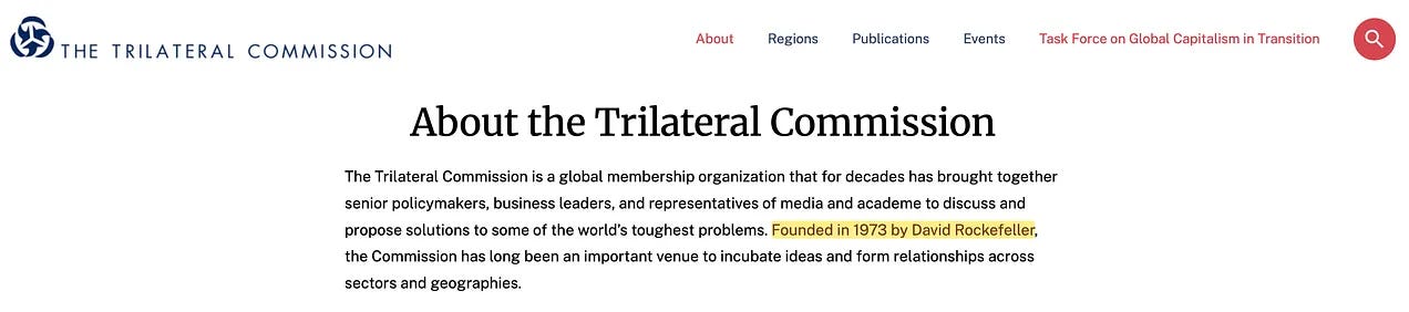 Αυτή είναι η Τριμερής Επιτροπή. Παρεμπιπτόντως, συνιδρυτής είναι ο ίδιος ο Brzezinski. Ο άλλος συνιδρυτής;