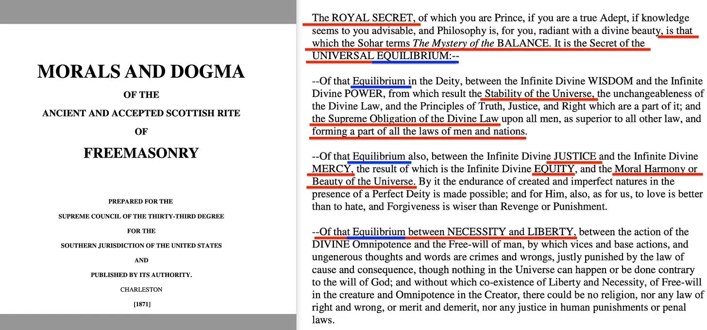 Pike: εσωτεριστικός μονισμός — Μέσα στην μασονική παράδοση, ο Albert Pike απεικόνιζε τον μυημένο — ειδικά τον 33° Ελευθεροτέκτονα — ως διαχειριστή της κοσμικής ισορροπίας. Αυτό ενσωματώνει μια σύνθεση ηθικής αρετής, μεταφυσικής διορατικότητας και δομικής τάξης. Ο κόσμος δεν πρέπει να κυβερνάται αυθαίρετα, αλλά να τακτοποιείται σύμφωνα με καθολικές αρχές προσβάσιμες μόνο μέσω πνευματικής μύησης και πειθαρχημένης ανόδου. Σε αυτό το πλαίσιο, η μασονική αντίληψη της θρησκείας — ορθολογική, ηθική και οικουμενική — είναι σχεδόν αδιακρίτως όμοια με την οπτική του Carus για τον επιστημονικό σοσιαλισμό: μια θρησκεία του φυσικού νόμου, καθοδηγούμενη από τη λογική και προσανατολισμένη προς την ηθική τελειότητα της ανθρωπότητας.
