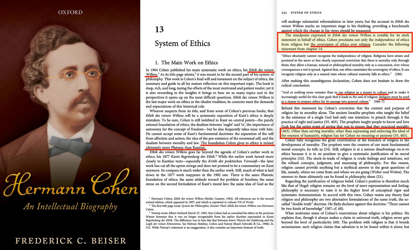 Hermann Cohen: ηθικο-νομικός μονισμός — Αναβιώνοντας τον Καντ μέσα από το πρίσμα της άπειρης κρίσης, ο Hermann Cohen πρότεινε ότι ο νόμος και η ηθική δεν είναι ξεχωριστοί τομείς, αλλά δύο εκφράσεις της ίδιας λογικής διαδικασίας. Οι νομικές νόρμες εξελίσσονται μέσω συνεχούς ηθικής εξέτασης. Η δικαιοσύνη δεν επιβάλλεται, αλλά συνάγεται μέσω μιας διαλογικής διαδικασίας που έχει τις ρίζες της στη σωκρατική έρευνα. Αντλώντας από τη χρυσή τομή του Αριστοτέλη, ο Cohen οραματίστηκε τον ηθικό νόμο όχι ως άκαμπτη εντολή, αλλά ως μια δυναμική εξέλιξη της ισορροπημένης ηθικής λογικής. Σε αυτό, συντάχθηκε στενά με τον Carus: και οι δύο ανέβασαν την ηθική ως το καθολικό υπόστρωμα κάτω από τη θρησκεία. Αλλά ενώ ο Carus επεδίωξε να ορθολογικοποιήσει τη θρησκεία σε επιστημονική ηθική, ο Cohen έβλεπε τη θρησκεία ως δευτερεύουσα — ένα πολιτισμικό μέσο για την κωδικοποίηση και τη μετάδοση ηθικής γνώσης στο πέρασμα του χρόνου. Για τον Cohen, η θρησκεία δεν αποκάλυπτε την ηθική αλήθεια — την μετέφερε. Ακόμα ένα χρήσιμο εργαλείο προστέθηκε στο Proletkult.