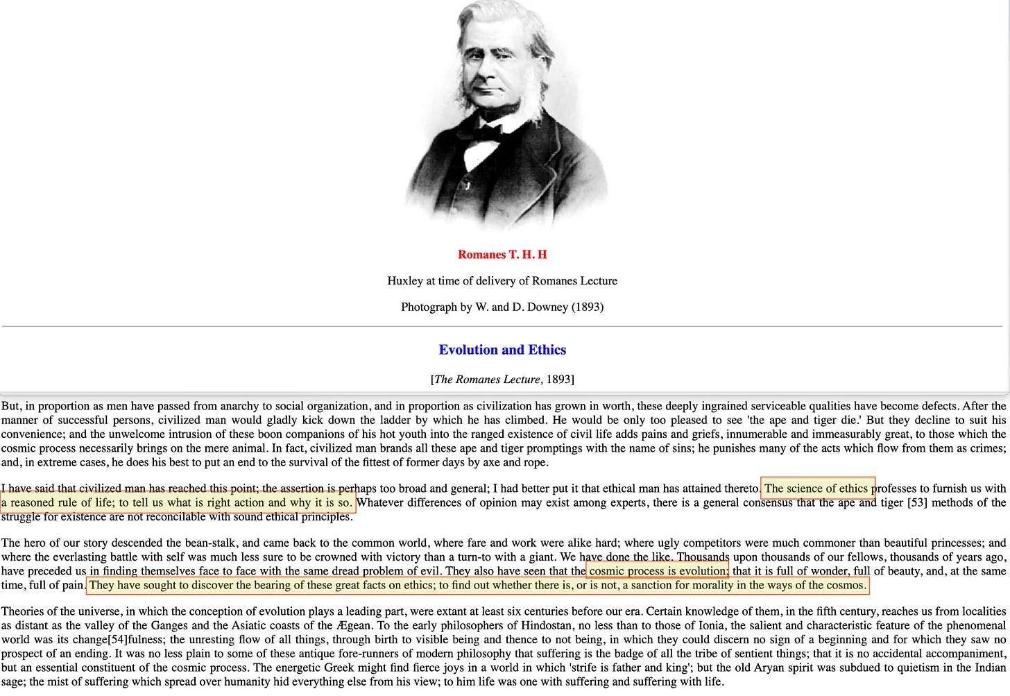 Ακόμη και η εξελικτική βιολογία επιστρατεύτηκε. Ο Thomas Henry Huxley — ο σθεναρός υπερασπιστής του Δαρβίνου, που συχνά αποκαλούταν «μπουλντόγκ» του [23] — χρησιμοποίησε τη διάλεξή του Romanes Lecture Evolution and Ethics [24] του 1893 για να αντιμετωπίσει το χάσμα μεταξύ της φυσικής επιλογής και της ηθικής προόδου. Η φύση, υποστήριξε, είναι αμοραλιστική. Ο ανθρώπινος πολιτισμός, αν θέλει να αναπτυχθεί, πρέπει να το κάνει ενάντια στα αδιάφορα ρεύματα της εξέλιξης. Αυτή η ένταση — μεταξύ του τι είναι και του τι πρέπει να είναι — επιβεβαίωσε την ανάγκη για διαχειριστική ευθύνη, όχι για παράδοση.