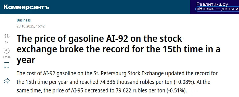 Σε αυτό το πλαίσιο, η Ρωσία εξακολουθεί να αντιμετωπίζει έλλειψη καυσίμων στην εγχώρια αγορά. Την ίδια στιγμή, οι «φίλοι» από τον μετασοβιετικό χώρο όχι μόνο είναι καλά εφοδιασμένοι, αλλά συχνά έχουν χαμηλότερες τιμές βενζίνης από τη Ρωσία λόγω των φορολογικών τους νόμων. Το Καζακστάν πουλάει το AI-92 περίπου 0,45 δολάρια ανά λίτρο, ενώ η Λευκορωσία το πουλάει για 0,76 δολάρια, έναντι 0,78 δολαρίων της Ρωσίας. Ακόμη και στο Kyrgyzstan και την Αρμενία, όπου οι τιμές είναι υψηλότερες, δεν υπάρχει έλλειψη λόγω της εισαγωγής καυσίμων από τη Ρωσία.
