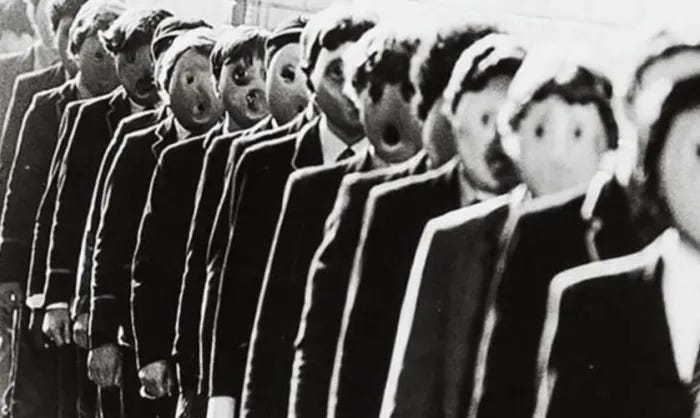 Λέμε στον εαυτό μας ότι είναι φυσιολογικό να υποτασσόμαστε απλώς σε αυτόν τον έλεγχο, να είμαστε καλοί πολίτες – όχι εξτρεμιστές ή ταραχοποιοί – και να αποδεχόμαστε ότι είναι ιερό καθήκον μας να μην αμφισβητούμε ποτέ ό,τι μας λένε οι αφέντες μας.