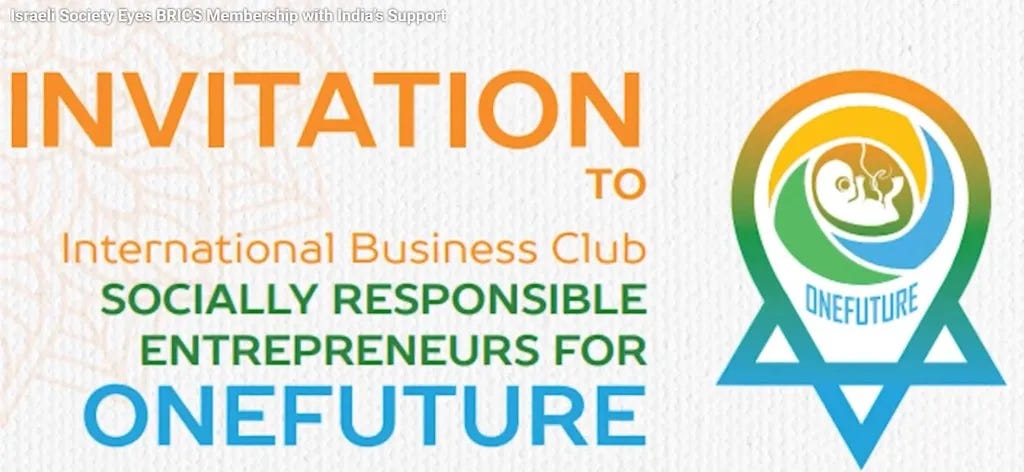 Αυτό το (όχι και τόσο εντυπωσιακό) βίντεο, που δημοσιεύθηκε στο YouTube με τον τίτλο «Η ισραηλινή κοινωνία στοχεύει στην ένταξη στις χώρες BRICS με την υποστήριξη της Ινδίας», προωθεί ένα συνέδριο με τίτλο «Κοινωνικά Υπεύθυνοι Επιχειρηματίες για το ONEFUTURE».