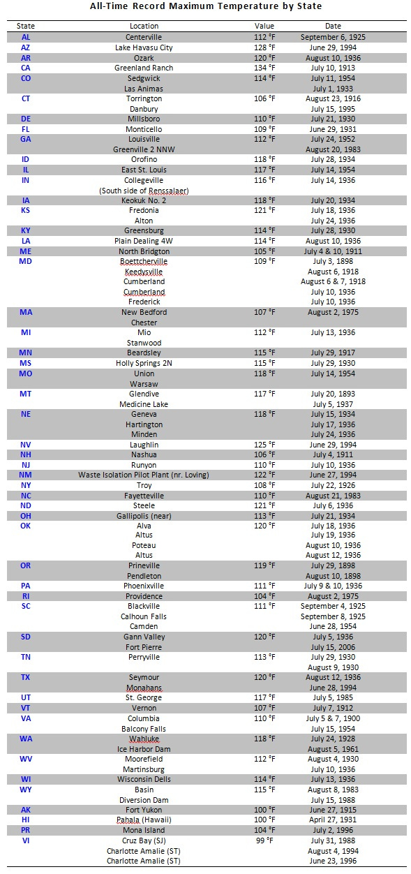 Σίγουρα κάνει ζέστη έξω! Και τι καλύτερη στιγμή για μια εργασία που δημοσιεύεται στο Journal of Applied Meteorology and Climatology και περιγράφει την κατασκευή των "ιστορικών" ρεκόρ για διάφορους τύπους ακραίων καιρικών φαινομένων για κάθε μία από τις 50 Ηνωμένες Πολιτείες συν το Πουέρτο Ρίκο και τις Αμερικανικές Παρθένες Νήσους. Η δημοσίευση περιγράφει λεπτομερώς τις προσπάθειες της Επιτροπής Κλιματικών Ακραίων Καταστάσεων των ΗΠΑ (SCEC) που συστάθηκε από το Εθνικό Κέντρο Κλιματικών Δεδομένων (NCDC) με επικεφαλής τον Dr. Karsten Shein. Βασικά, η SCEC ξεσκόνισε παλιά αρχεία και βρήκε άλλες νέες πηγές. Έτσι, τώρα έχουμε "νέα και βελτιωμένα" δεδομένα (διαθέσιμα εδώ) για την τιμή, την ημερομηνία και τη θέση της υψηλότερης και της χαμηλότερης θερμοκρασίας όλων των εποχών, της μεγαλύτερης 24ωρης βροχόπτωσης, της μεγαλύτερης 24ωρης χιονόπτωσης και του μεγαλύτερου βάθους χιονιού για 50 πολιτείες και δύο εδάφη. Τα ακραία ρεκόρ σε όλη την πολιτεία έχουν ενημερωθεί μέχρι το 2011 και υπόκεινται σε συνεχή ενημέρωση.