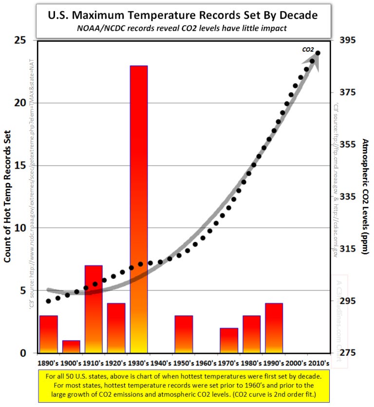 Αυτό είναι ιδιαίτερα εντυπωσιακό δεδομένης της αυξανόμενης αστικοποίησης των ΗΠΑ και της συνακόλουθης "μη κλιματικής" θέρμανσης που παρεισφρέει σε προηγουμένως παρθένα αρχεία. Αν όλα τα άλλα είναι ίσα -και χωρίς αύξηση της θερμοκρασίας από τα αυξημένα αέρια του θερμοκηπίου- τα περισσότερα πολιτειακά ρεκόρ θα έπρεπε να βρίσκονται σε μεγάλες πόλεις ή κοντά σε αυτές. Αλλά δεν είναι.