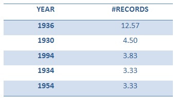 Στον Πίνακα 2, συγκεντρώσαμε τα πέντε κορυφαία έτη κατά τα οποία σημειώθηκαν τα περισσότερα ρεκόρ. Όταν πολλαπλά έτη ισοβαθμούν για το υψηλότερο, κάθε μεμονωμένο έτος λαμβάνει ένα κλάσμα "ρεκόρ". Έτσι, για παράδειγμα, το 1954 και το 1933 παίρνουν από ένα μισό ρεκόρ για το Κολοράντο.