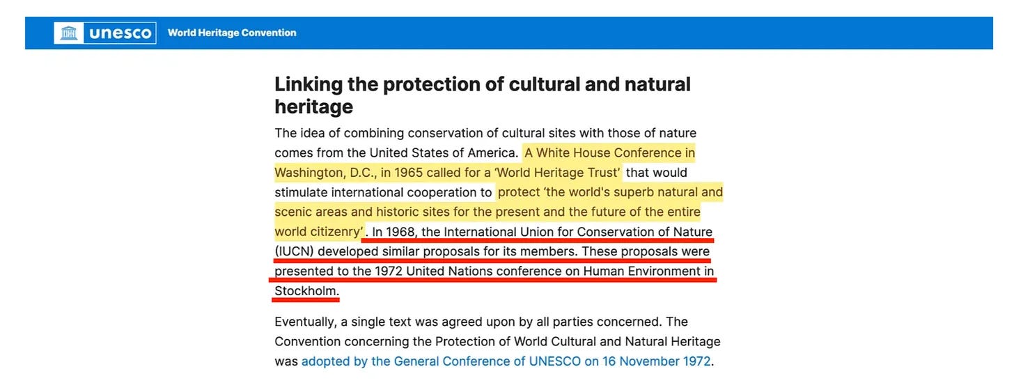 Και την IUCN την είδαμε επίσης νωρίτερα, στο θέμα της Επιτροπής Παγκόσμιας Κληρονομιάς της UNESCO. Διότι, όπως αναφέρει το site της, η IUCN επεξεργάστηκε παρόμοιες προτάσεις για τα μέλη της το 1968... δύο από τους οποίους (Coolidge & Train) ήταν συντάκτες του κειμένου του 1965, που παρουσιάστηκε στον Λευκό Οίκο.