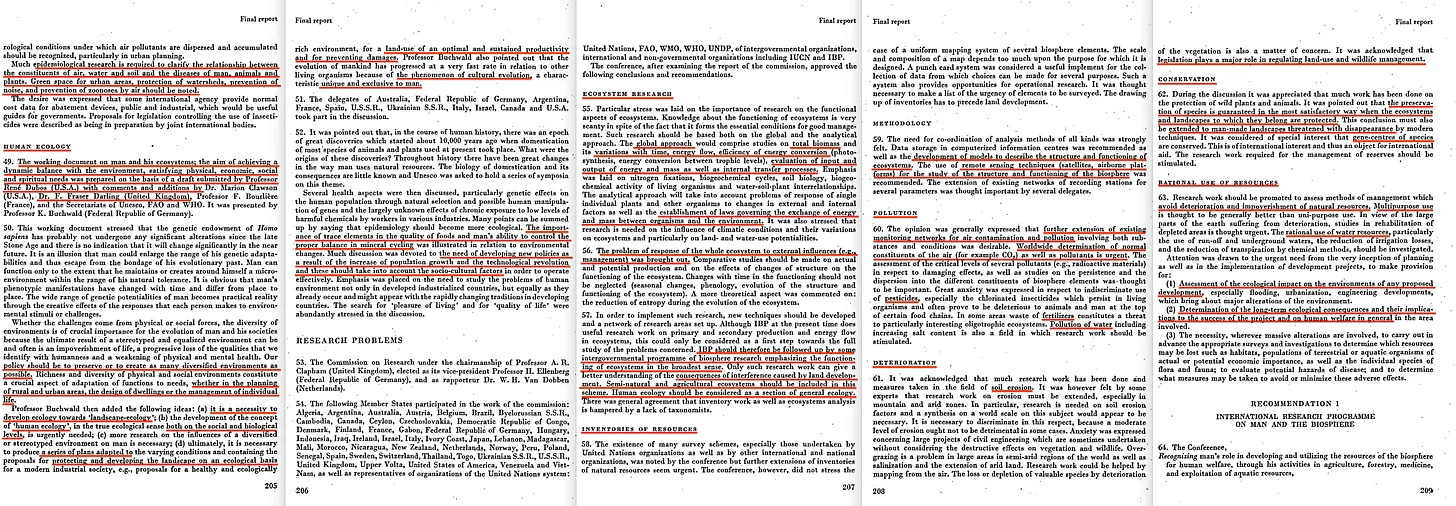 «Το έγγραφο εργασίας για τον άνθρωπο και τα οικοσυστήματά του- ο στόχος της επίτευξης μιας δυναμικής ισορροπίας με το περιβάλλον, που να ικανοποιεί τις φυσικές, οικονομικές, κοινωνικές και πνευματικές ανάγκες, εκπονήθηκε με βάση σχέδιο που υπέβαλε ο καθηγητής René Dubos (Η.Π.Α.) με σχόλια και προσθήκες της Dr. Marion Clawson (Η.Π.Α.), . Dr. F. Fraser Darling (Ηνωμένο Βασίλειο),»