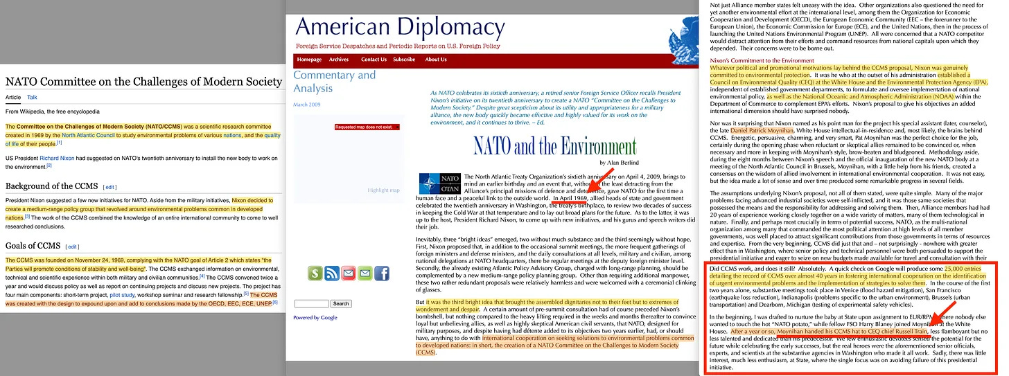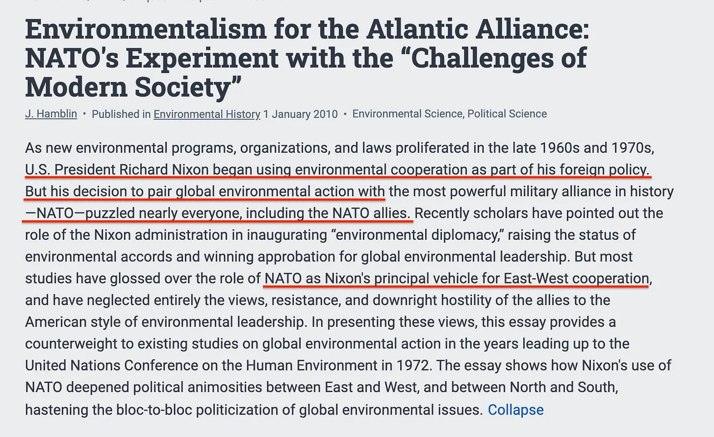 Τώρα, το 2010, ένα άρθρο με τίτλο: ‘Environmentalism for the Atlantic Alliance: NATO's Experiment with the "Challenges of Modern Society"’ («Περιβαλλοντισμός για την Ατλαντική Συμμαχία: Το πείραμα του ΝΑΤΟ με τις «προκλήσεις της σύγχρονης κοινωνίας») κυκλοφόρησε σε ένα τεύχος του περιοδικού «Environmental History» [23]. Αναφέρει όχι μόνο ότι «οι περισσότερες μελέτες έχουν αποσιωπήσει το ρόλο του ΝΑΤΟ ως το κύριο όχημα του Nixon για τη συνεργασία Ανατολής-Δύσης», αλλά -