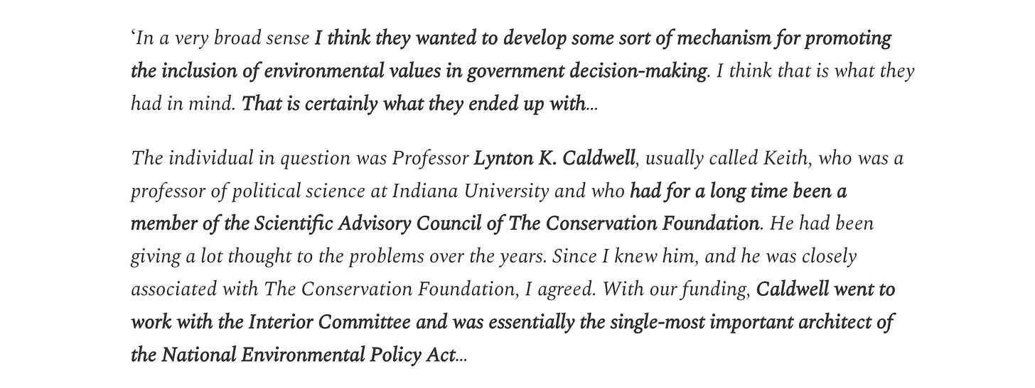 Κάλυψα τη NEPA στο άρθρο για το Ίδρυμα Διατήρησης (που συνδέεται παραπάνω), αλλά αυτό που έχει σημασία είναι ότι ο κύριος αρχιτέκτονας της NEPA ήταν ο Lynton K Caldwall.