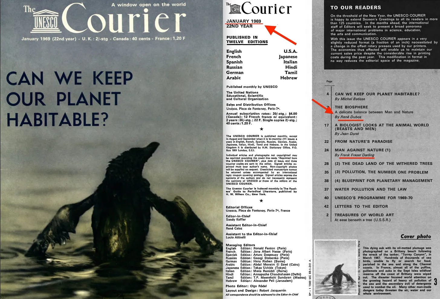 1968. Διάσκεψη της UNESCO για τη βιόσφαιρα. Ζητάει τον Άνθρωπο και τη Βιόσφαιρα (αποθέματα), παγκόσμια «περιβαλλοντική» επιτήρηση, παγκόσμια απογραφή των φυσικών πόρων, και περιγράφει ζωονοσογόνες ασθένειες που οφείλονται στην έλλειψη «ισορροπίας» του ανθρώπου με το περιβάλλον, και την ανάγκη να δημιουργηθεί η εν λόγω «ισορροπία» για να «διατηρηθεί» η «υγεία και η ευημερία του με την ευρύτερη έννοιά τους».
