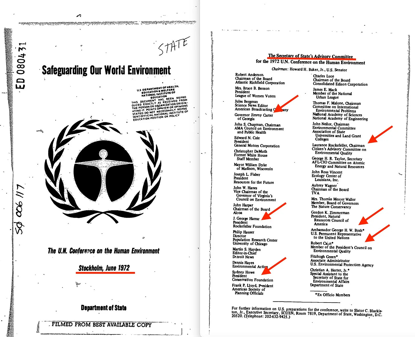 Το αρχικό έγγραφο για την προστασία του περιβάλλοντος υπογράφηκε φυσικά στα τέλη Μαΐου του 1972... δηλαδή αμέσως πριν από το μεγάλο γεγονός εκείνης της χρονιάς. UNCED στη Στοκχόλμη [20], που οργανώθηκε από τον Maurice Strong. Και ποιον βρίσκουμε στην αμερικανική συμβουλευτική επιτροπή;