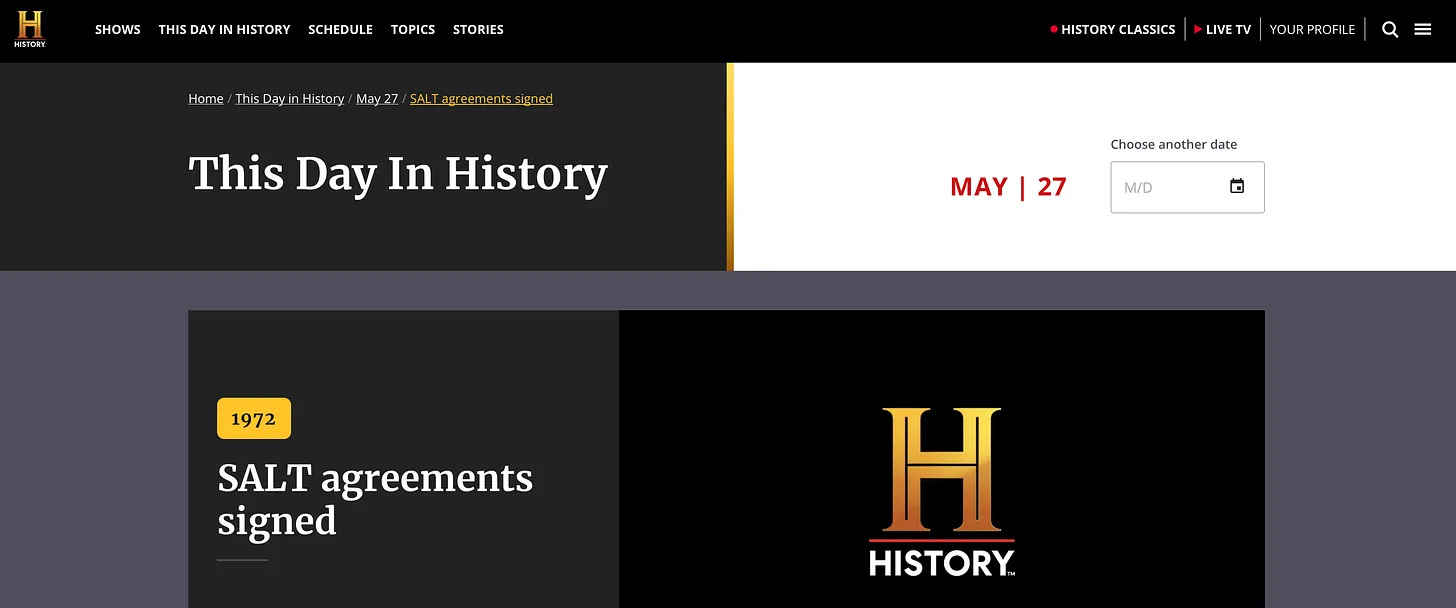 1972. Τα παραπάνω αγνοούνται αμέσως από τα ΜΜΕ, καθώς υπογράφεται η Συμφωνία για τον Περιορισμό των Στρατηγικών Όπλων - SALT - Agreement.