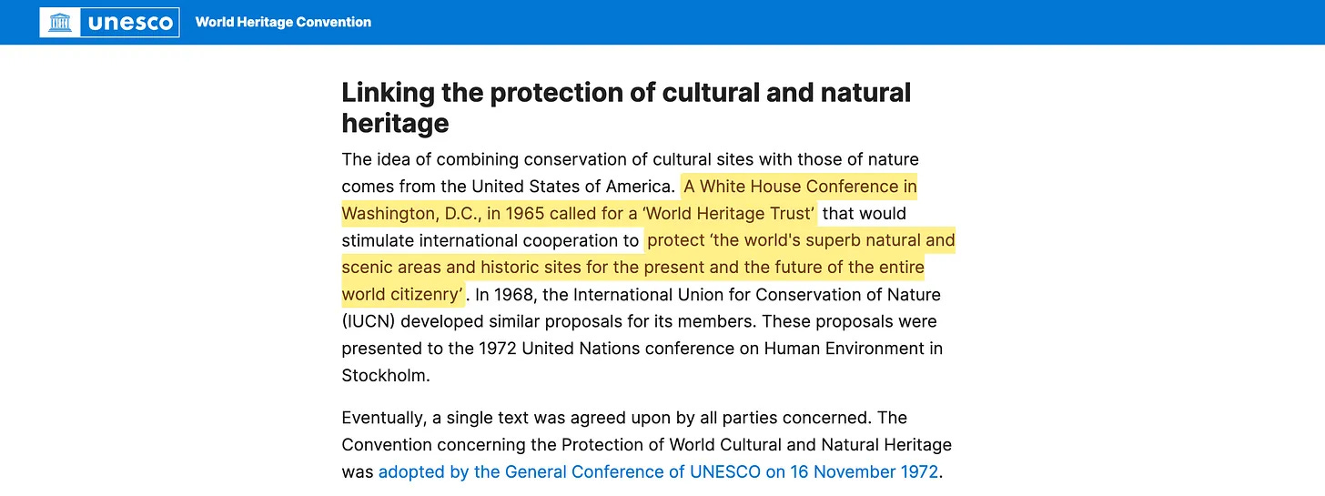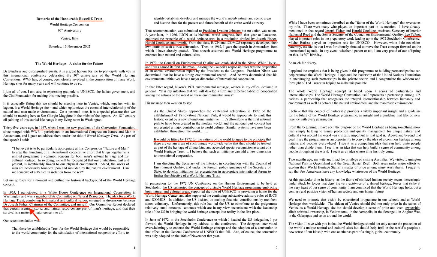 1965. Η Διάσκεψη του Λευκού Οίκου για τη Διεθνή Συνεργασία, που οδηγεί στην τελική δημιουργία της Σύμβασης της UNESCO για την Παγκόσμια Κληρονομιά, όπως συντάσσεται από τους Russell E Train (Conservation Foundation, EPA, CEQ, IUCN), Joseph Fisher (Resources for the Future) και Harold Coolidge (IUCN).