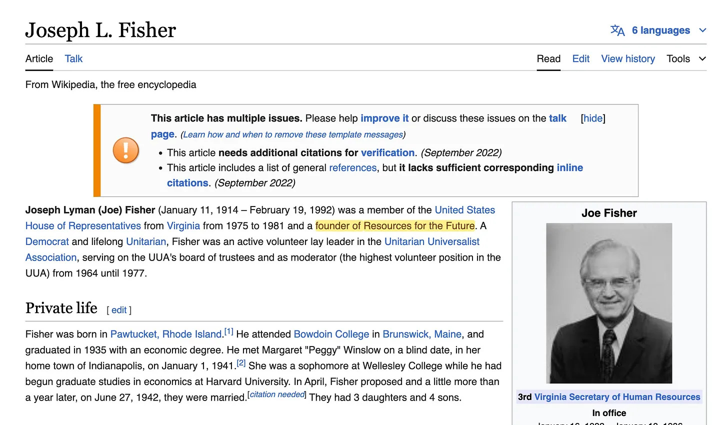 Όσο για το Heritage trust και τον Joe Fisher - ίδρυσε το Resources for the Future [8] , με σχεδόν παράλογα επίπεδα χρηματοδότησης από τα ιδρύματα Ford και Rockefeller. Και ήταν εκείνοι που το 1963 πρότειναν τη χρήση του παράλογου μοντέλου Contingent Valuation Model για τη μέτρηση της οικονομικής αξίας της αξίας της αναψυχής. Και αυτό το μοντέλο CVM θα χρησιμοποιούνταν αργότερα για τον υπολογισμό της «αξίας μη χρήσης» (και αναψυχής) του περιβάλλοντος για χάρη της αποτίμησης των «υπηρεσιών οικοσυστήματος».