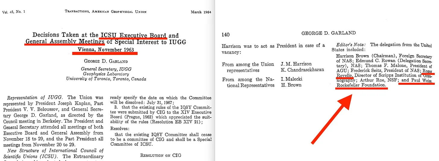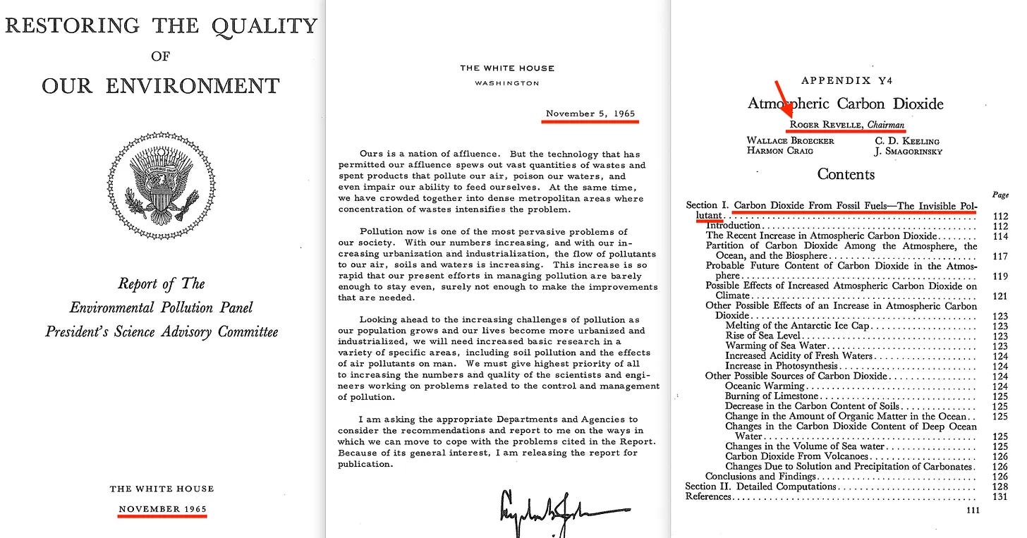 Όσον αφορά το τελευταίο, πρόκειται για την απατηλή «συναίνεση για τον άνθρακα» του 1963, όπως την παρουσίασε (μέσω ενός παραπλανητικού λόγου) ο ίδιος ο -γιατί, αν δεν είναι ο κ. Roger Revelle [26]- «υπότροφος του Rockefeller με 1 εκατομμύριο δολάρια». Τώρα κοιτάξτε την ημερομηνία. Αυτή η «βέλτιστη διαθέσιμη επιστήμη» ήρθε ακριβώς στην ώρα της για το συνέδριο του Λευκού Οίκου το 1965. Τι εξαιρετική σύμπτωση!